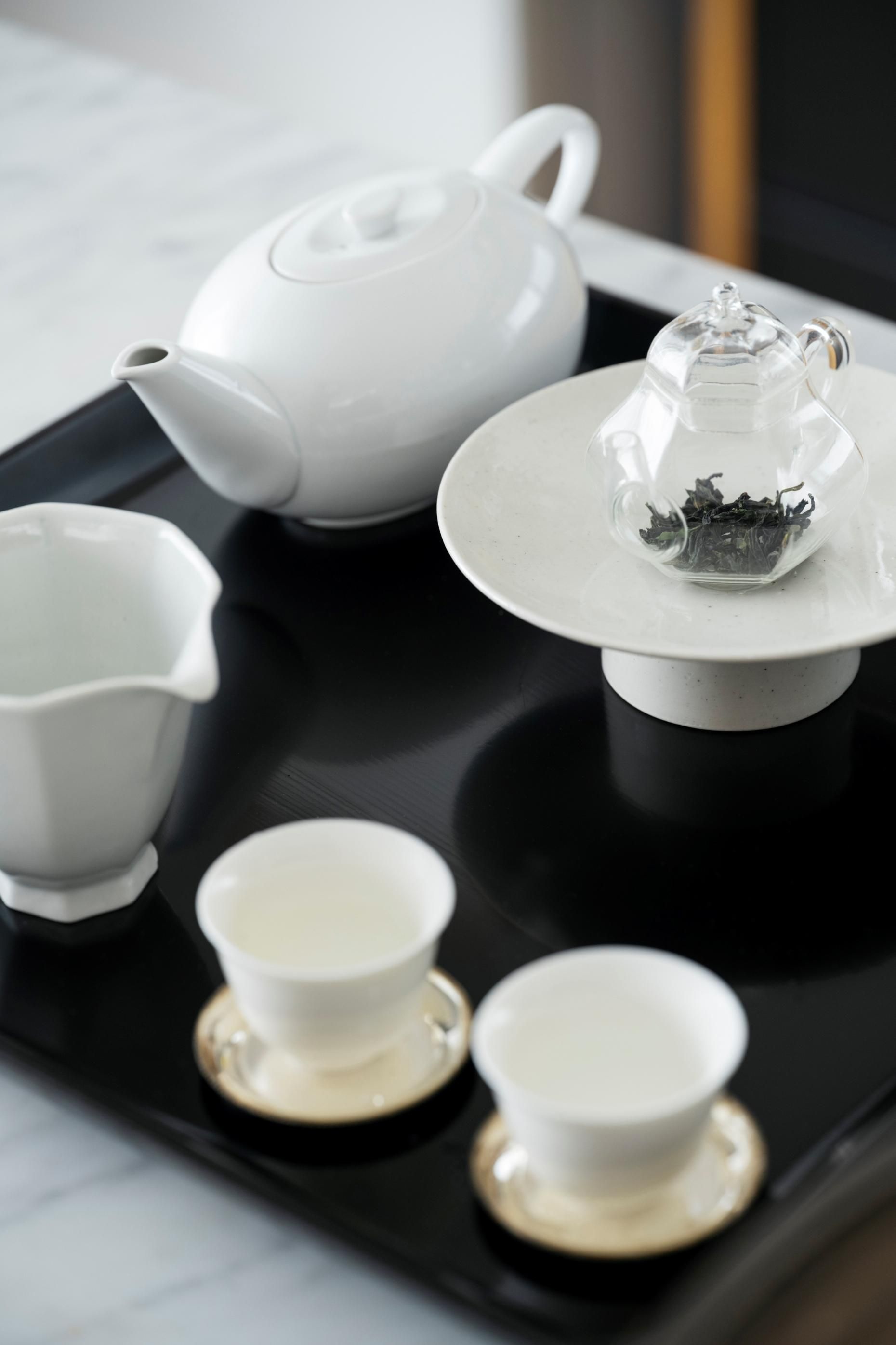 「茶壺 (チャフウ・中国茶を淹れるための急須) 」 として使うにはサイズが大きすぎるので、 中国茶ではあまり使わないのですが、 高温のお湯を使わない茶葉を楽しむ際の湯冷ましとして使ってはどうだろうという提案です。 黒い漆の折敷の上で、 様々な国の "白" を組み合わせてみました。
