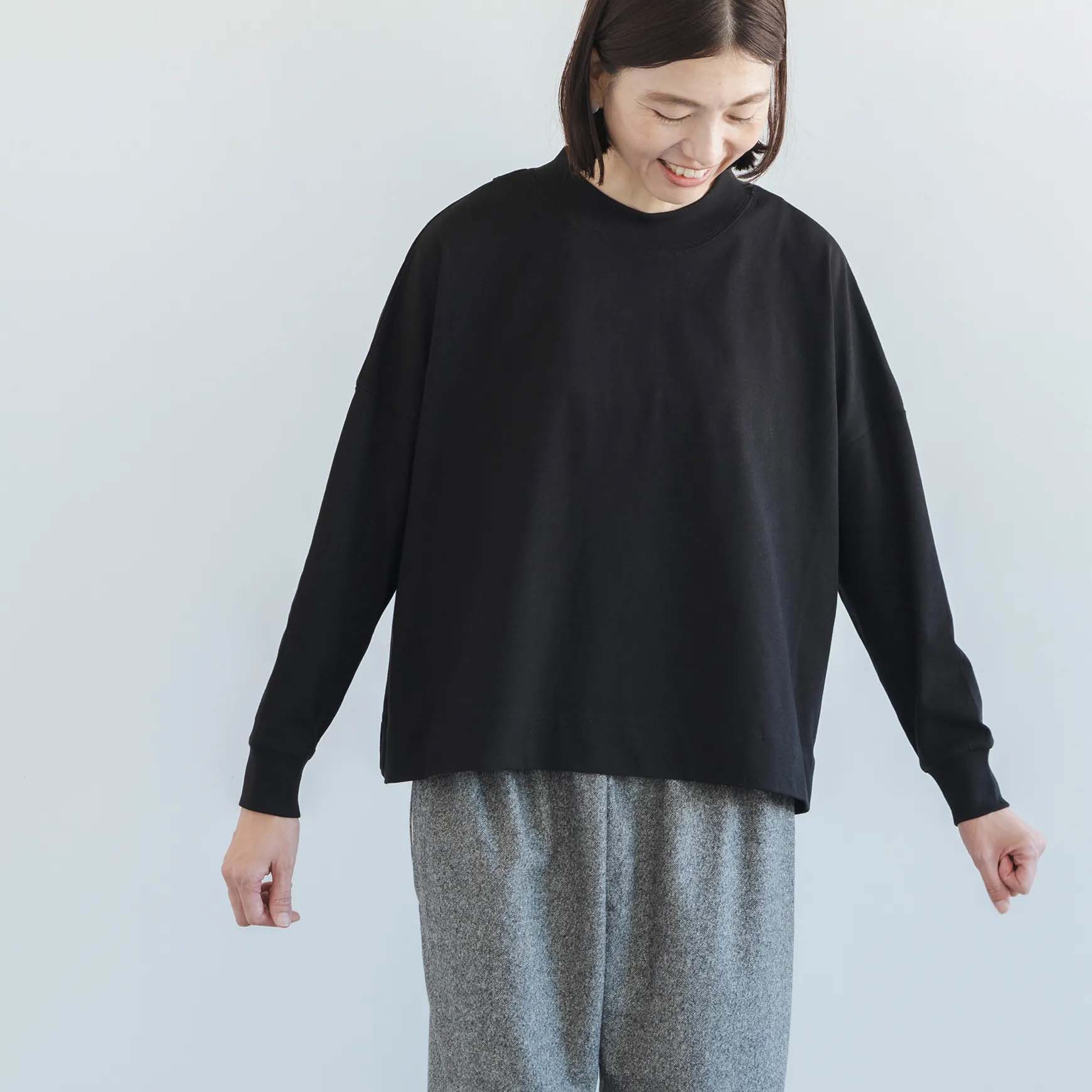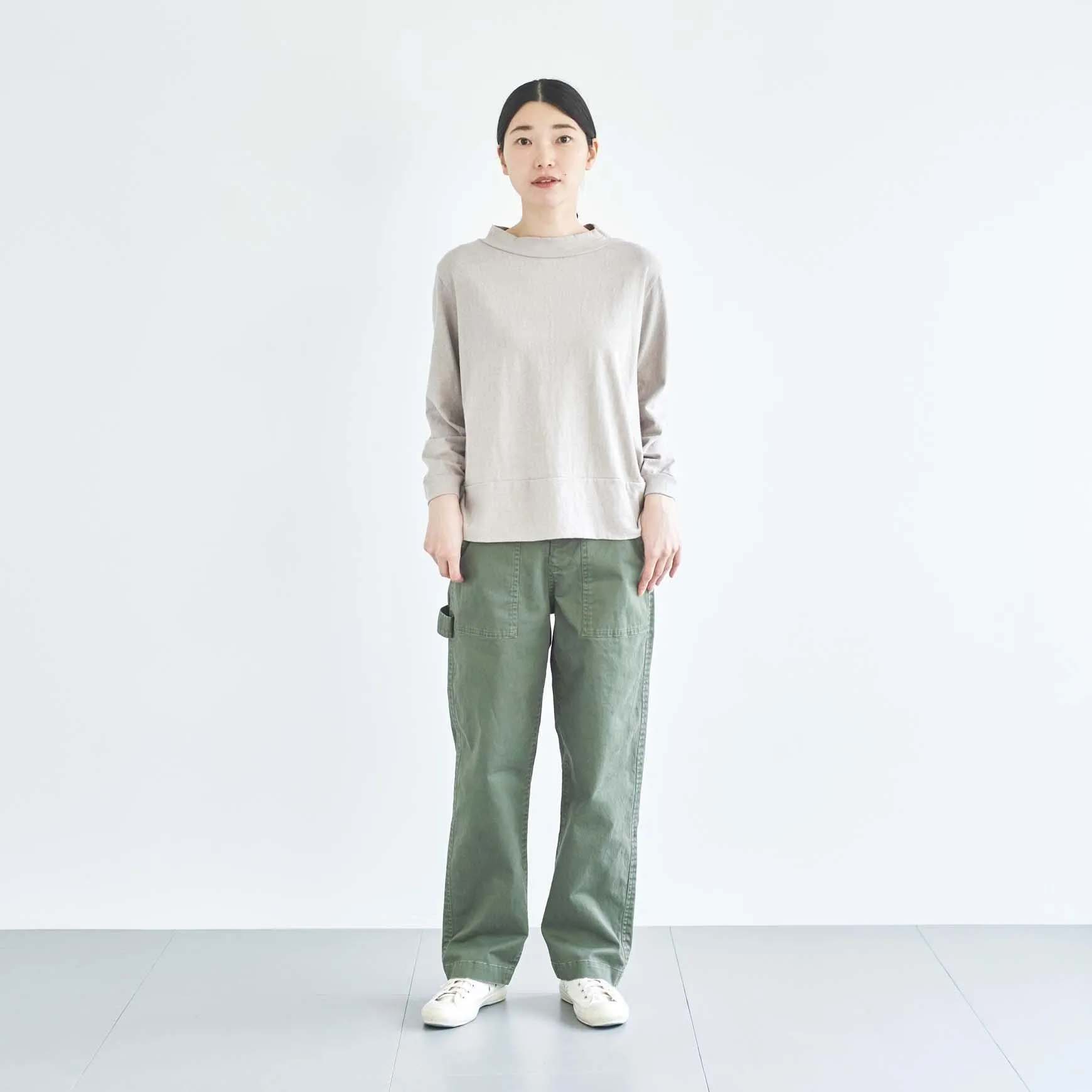 スクエアシルエットでゆったりとした身幅の pot and tea の長袖カットソー。 肩まわりや背中まわり、襟のかたちや袖口など、細かなところにこだわりの感じられる一枚。 厚すぎず薄すぎない生地で、とにかく快適な着心地! 白のボーダー、カーキのボーダー、ブラックの3色、どれも人気を集めました。