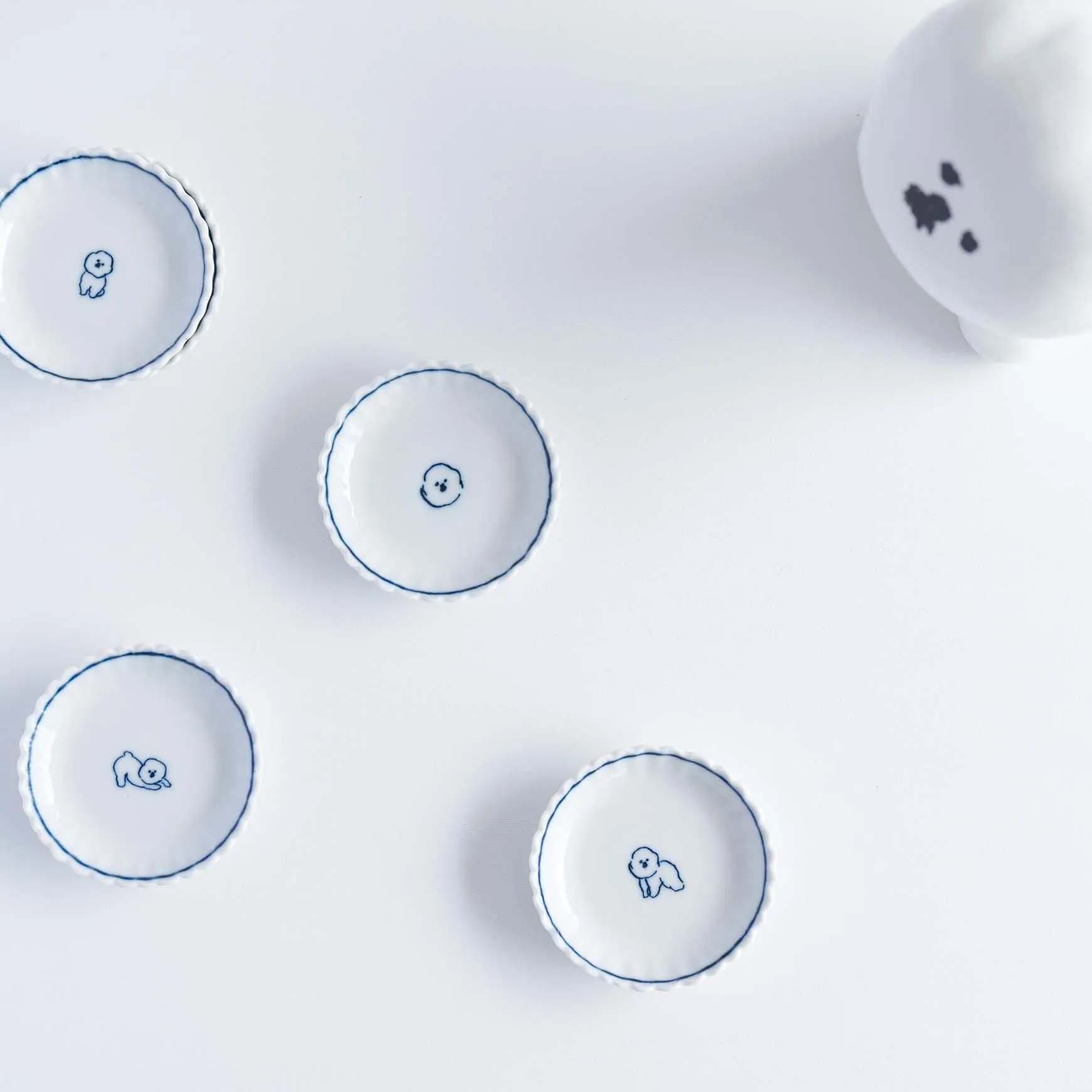 直径6cm、小さな中にかわいらしさの詰まった 東屋の手塩皿。 呉須輪線で仕上げた手塩皿は普段使いしやすく、食卓にもよく馴染みます。 立っていたり、伸びをしていたり、ちょこんと座っていたり・・・ 全5ポーズの MAMBO のお皿は、年末年始のおめでたい席でも活躍しますよ!
