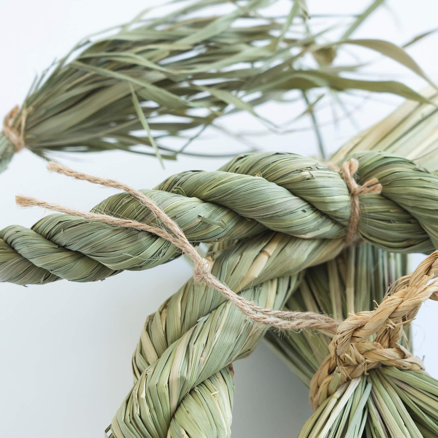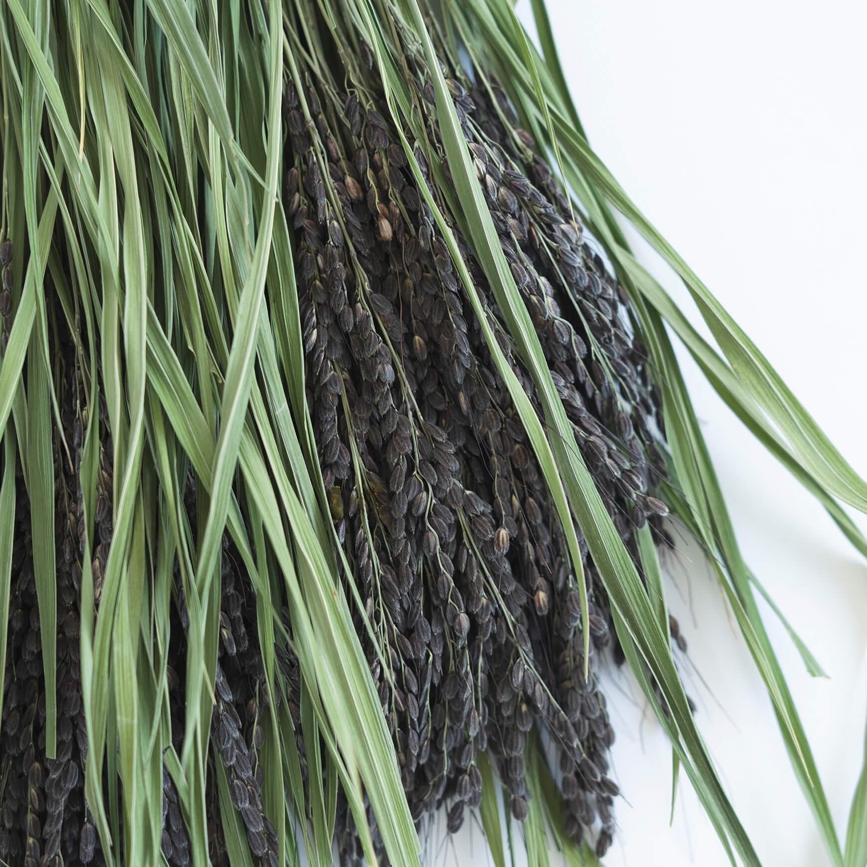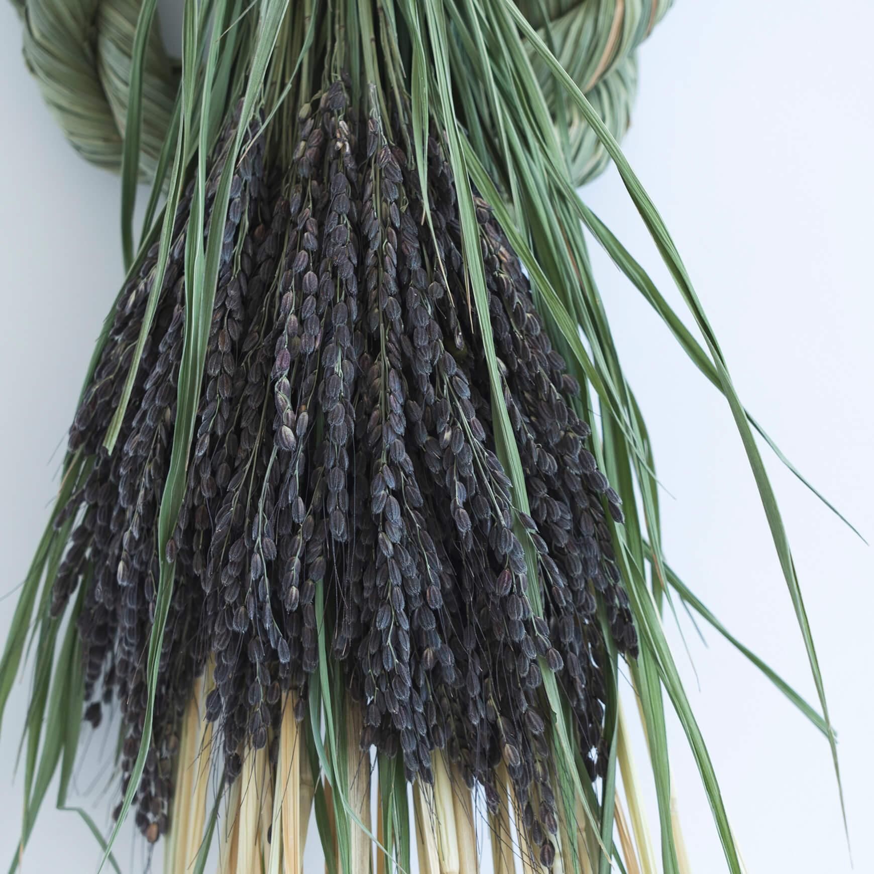 ことほき のしめ飾りは、その年のしめ飾り作りに必要な藁の量を見越し、稲の作付けを行うところからはじまります。稲がまだ青いうちに刈り取り、乾燥させた実取らずの藁を用いて作られるしめ飾りからは、青々とした藁の香りがふわりと立ち上がります。