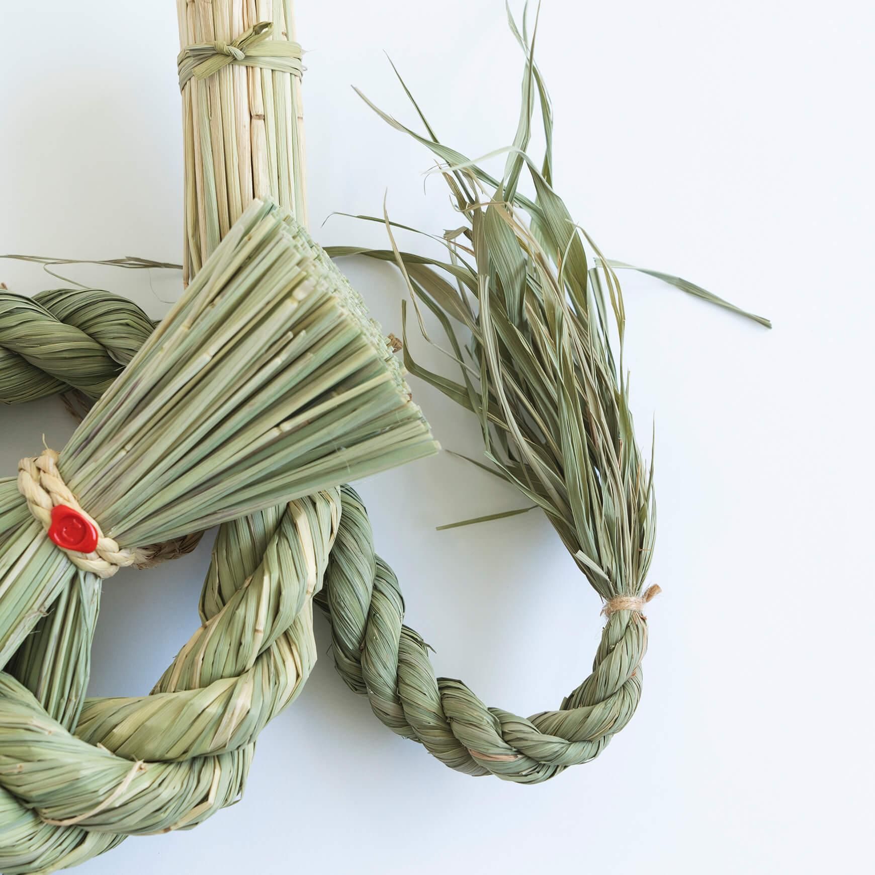 美しく切りそろえられた藁の断面。細部へのこだわりが、ことほき のしめ飾りの洗練された雰囲気を生み出しています。