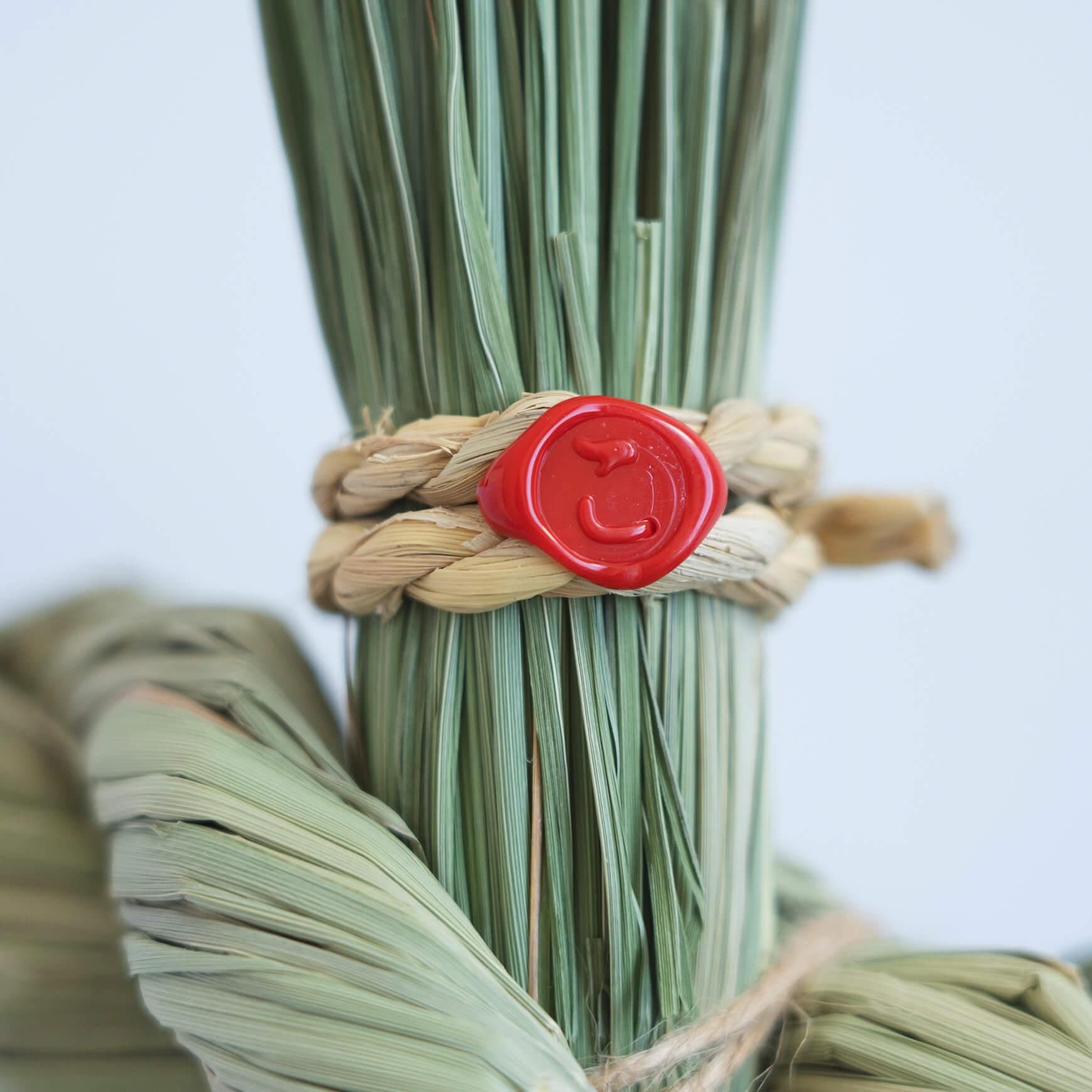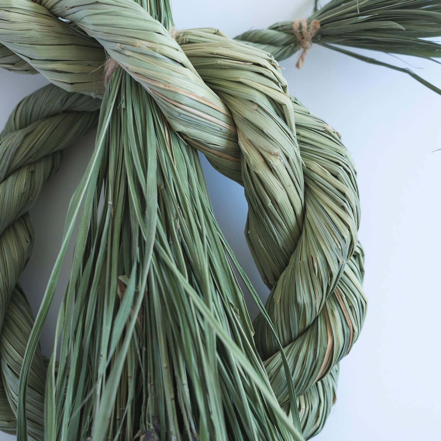 美しく切りそろえられた藁の断面。細部へのこだわりが、ことほき のしめ飾りの洗練された雰囲気を生み出しています。