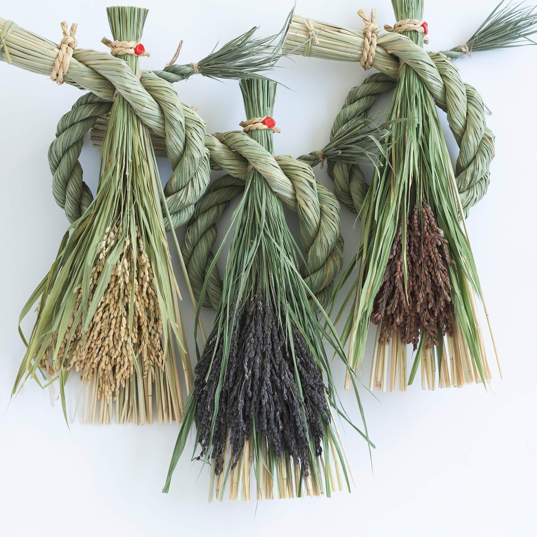 ことほき のしめ飾りは、その年のしめ飾り作りに必要な藁の量を見越し、稲の作付けを行うところからはじまります。稲がまだ青いうちに刈り取り、乾燥させた実取らずの藁を用いて作られるしめ飾りからは、青々とした藁の香りがふわりと立ち上がります。