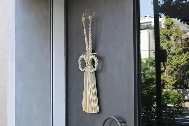 美しく切りそろえられた藁の断面。細部へのこだわりが、ことほき のしめ飾りの洗練された雰囲気を生み出しています。