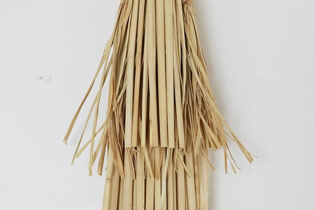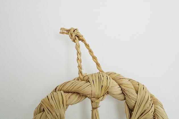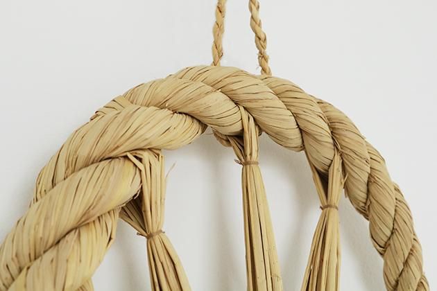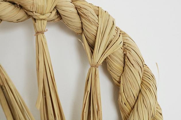 美しく切りそろえられた藁の断面。細部へのこだわりが、ことほき のしめ飾りの洗練された雰囲気を生み出しています。