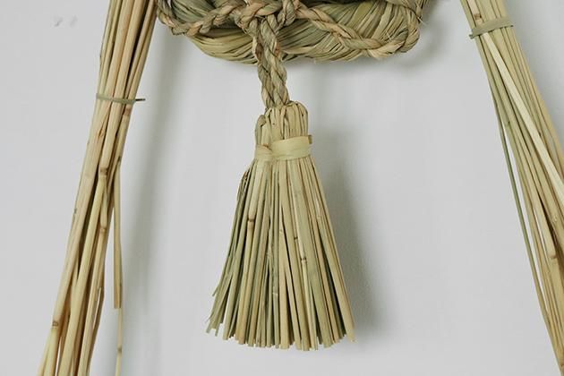 美しく切りそろえられた藁の断面。細部へのこだわりが、ことほき のしめ飾りの洗練された雰囲気を生み出しています。