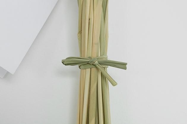 ことほき のしめ飾りは、その年のしめ飾り作りに必要な藁の量を見越し、稲の作付けを行うところからはじまります。稲がまだ青いうちに刈り取り、乾燥させた実取らずの藁を用いて作られるしめ飾りからは、青々とした藁の香りがふわりと立ち上がります。