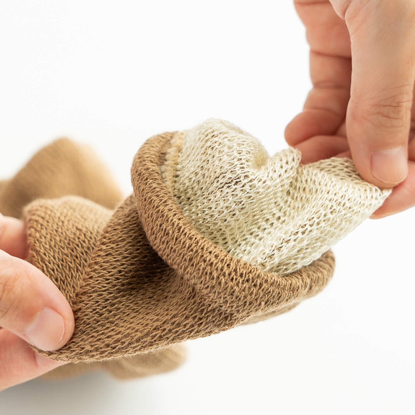 内側は、絹紡糸というシルク100%の糸を使用。吸湿性と保湿発散性に優れたシルクは、サラッとした上質な肌触りです。