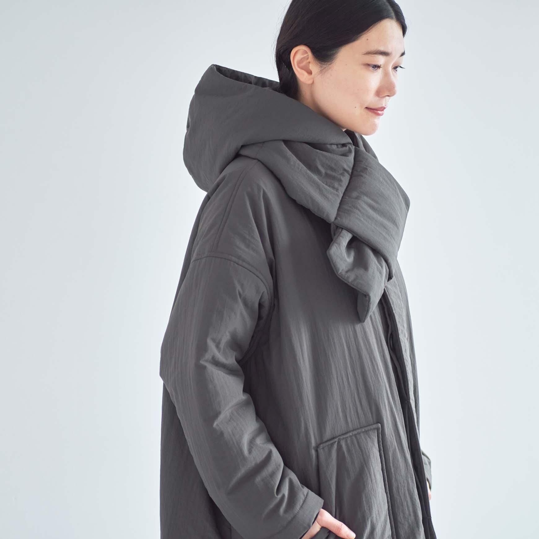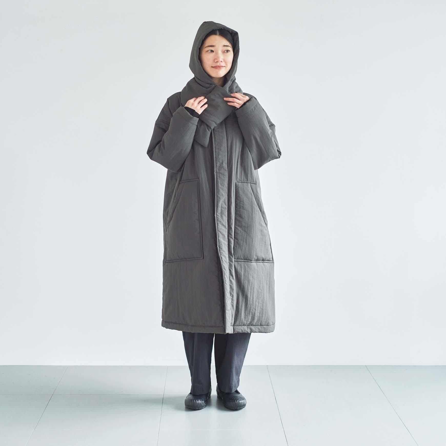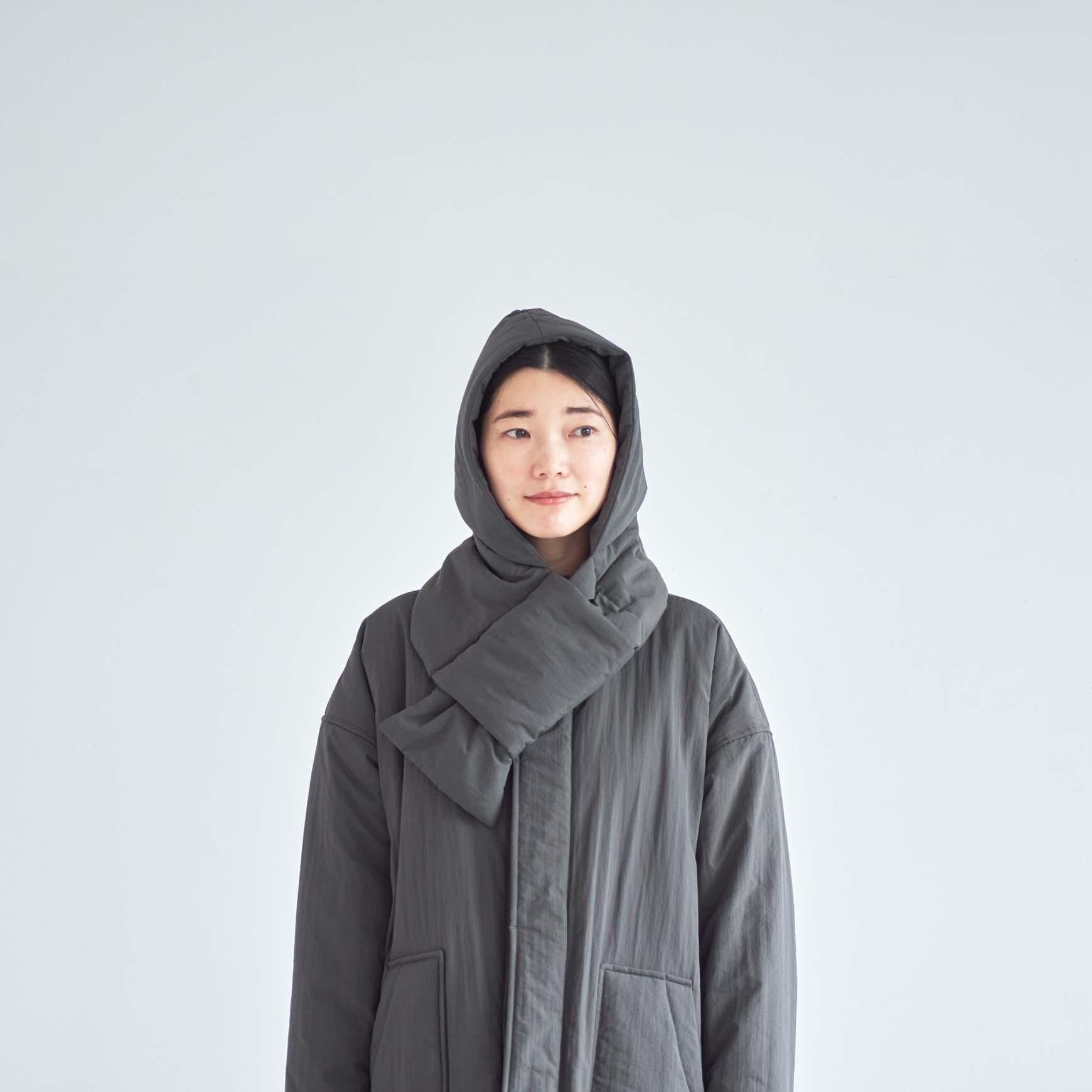 ふわふわと暖かなネックカバーは、フード付きのデザイン。