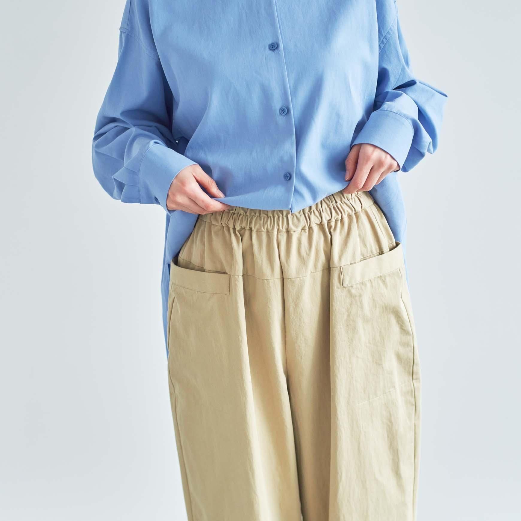 幅広い体系の方にも着やすいボリューム感のあるコクーンシルエットのパンツは、両サイドに施した大きなポケットがポイントです。