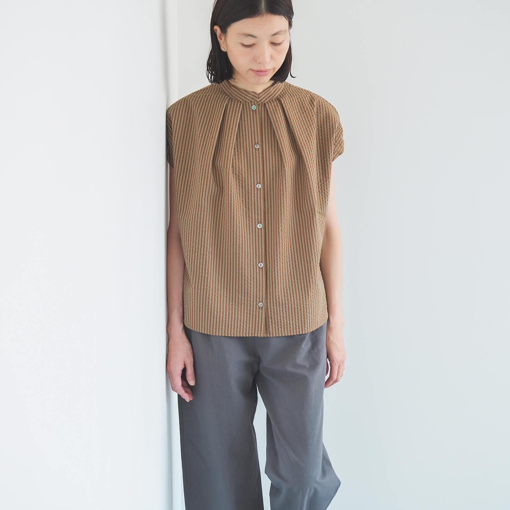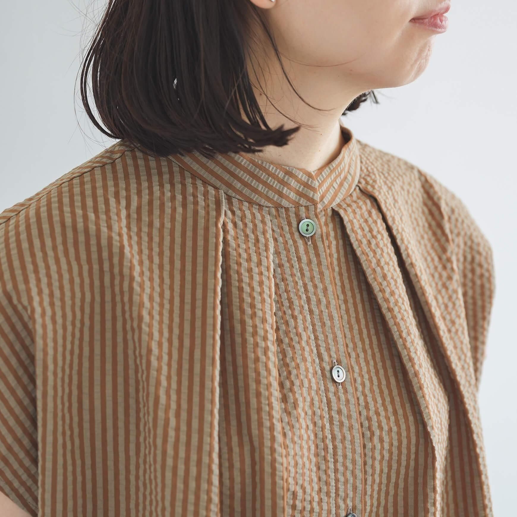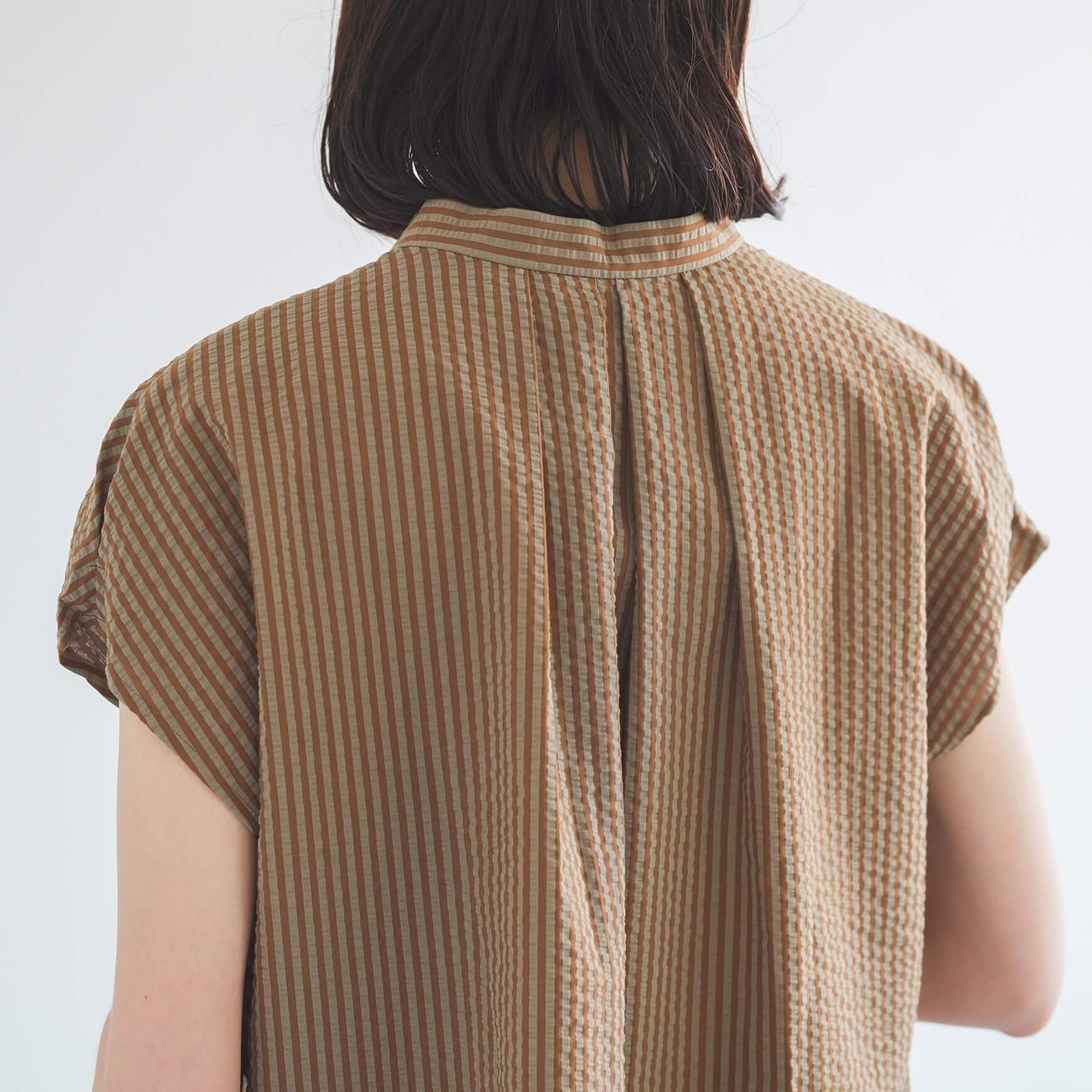 カラーは、ブラウンとネイビーの2色。サッカー地の涼しい素材と、落ち着きのある配色のストライプ柄は、まだ暑さの残る晩夏にも最適です。