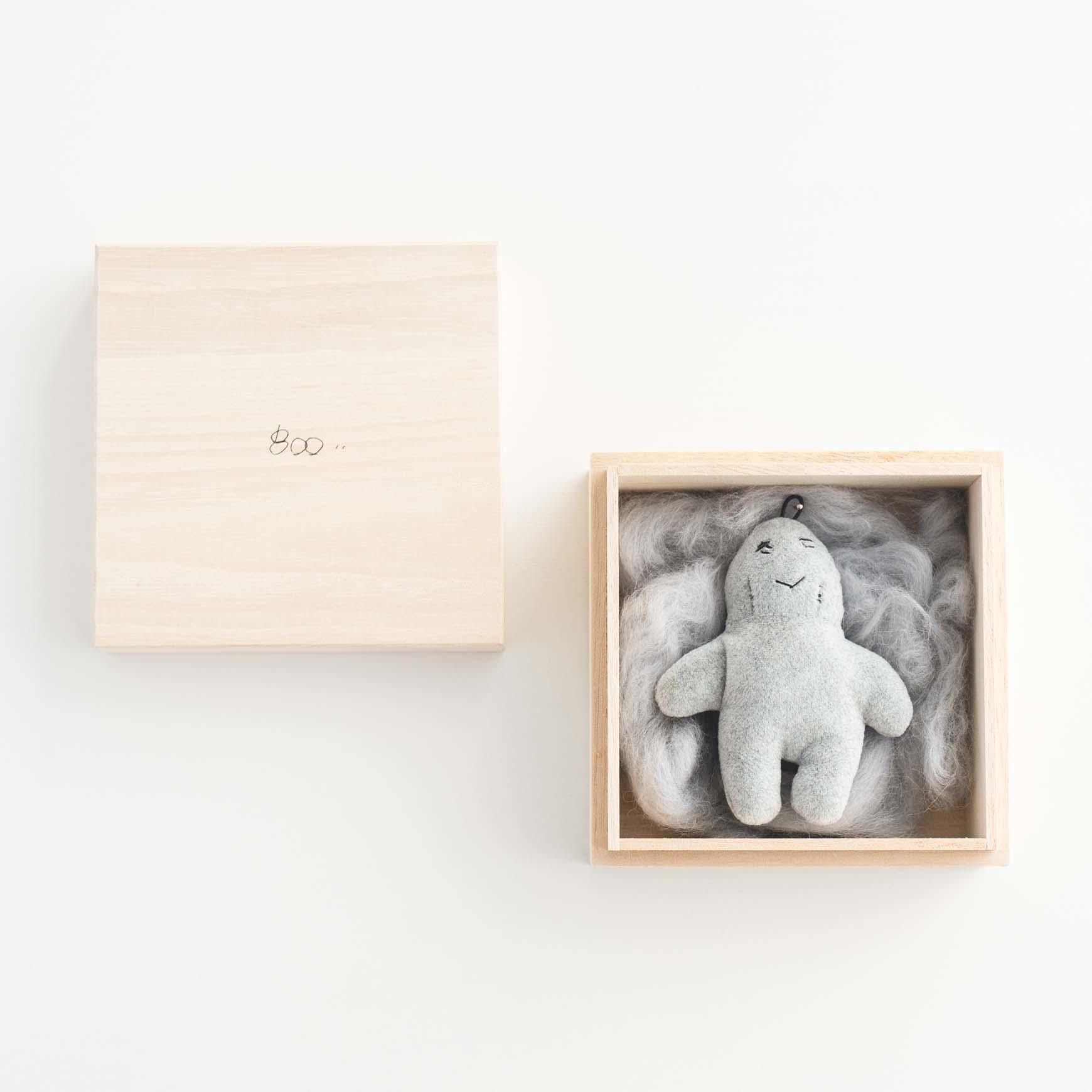 あたまの部分にループが付いているので、ピンに掛けて壁に飾ったり、紐やキーチェーンを通して一緒にお出かけしたり、専用の桐箱に入れてデスクや棚に置いたりと、自由にお楽しみいただけます。