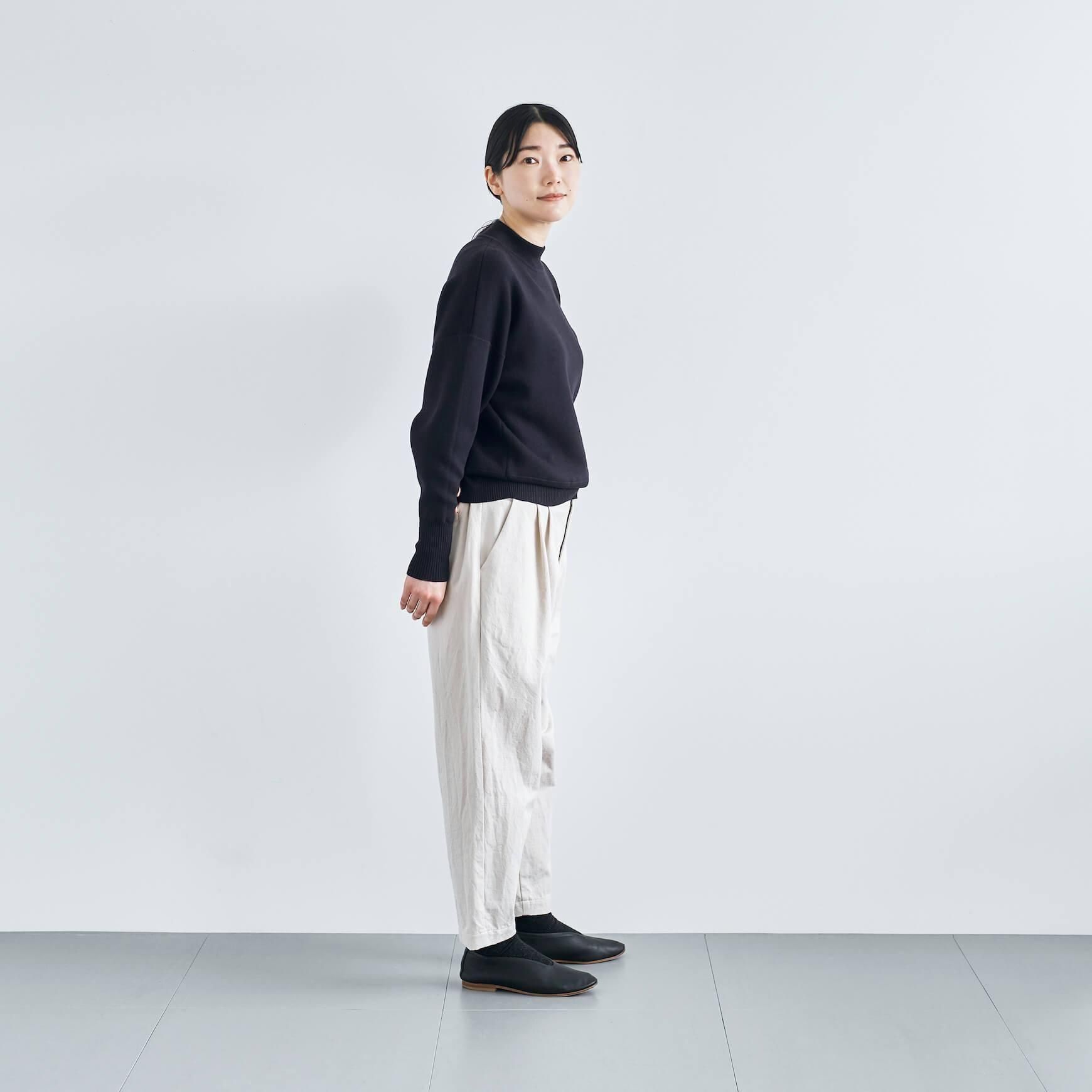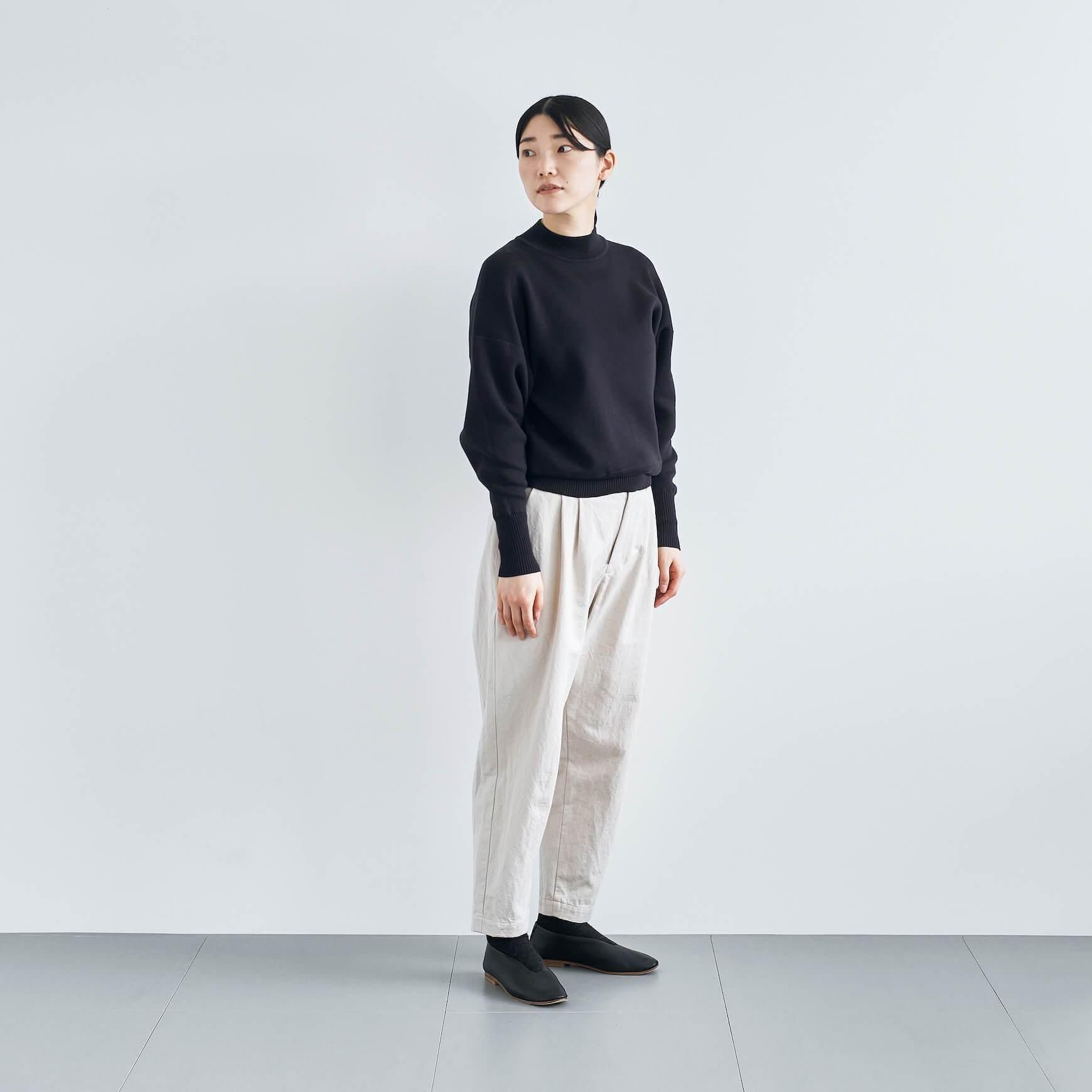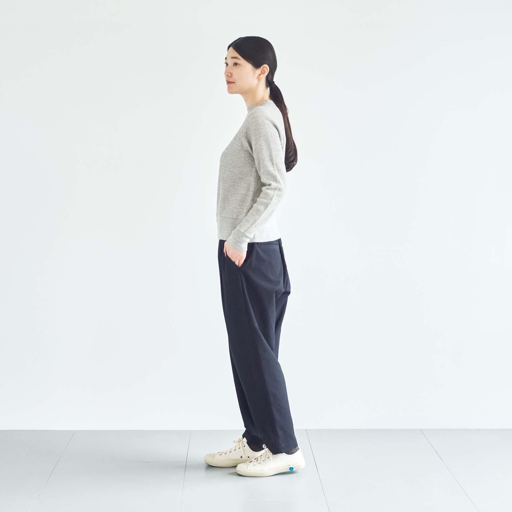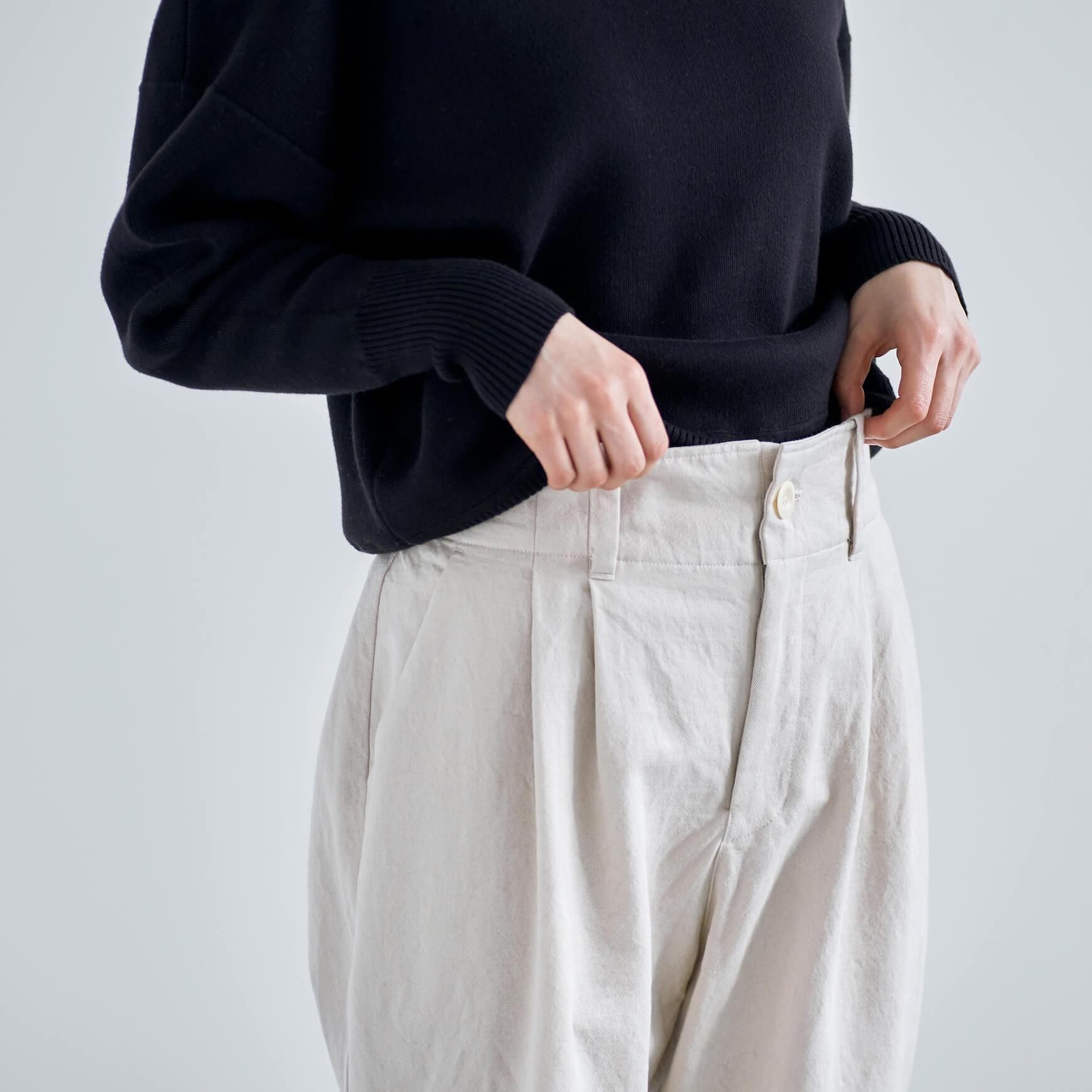 薄すぎず厚すぎない上質な綿ウールの生地で、カジュアルな中にもきちんと感のある9分丈のテーパードパンツを作りました。