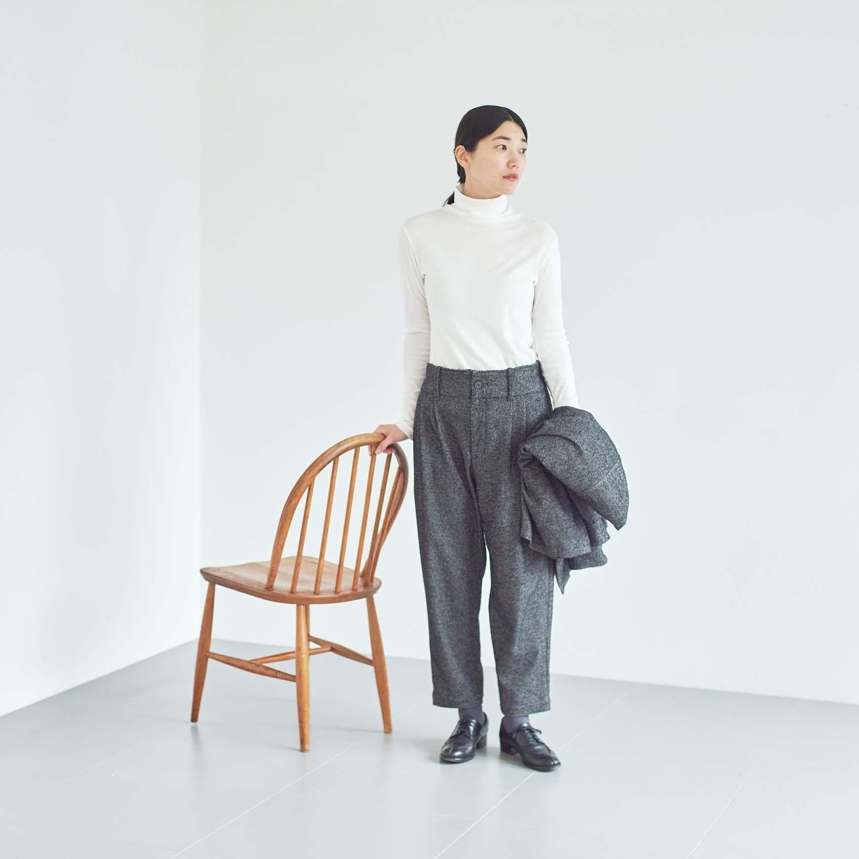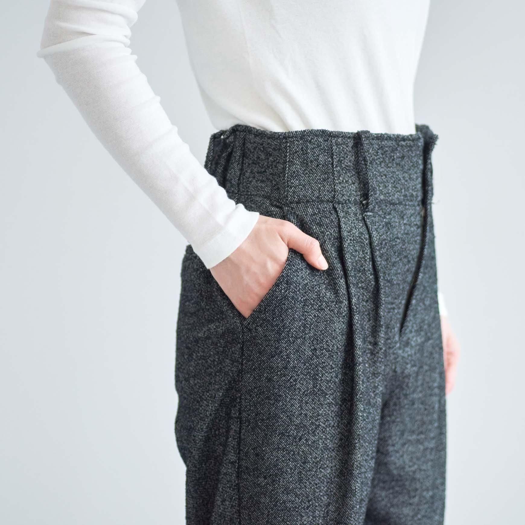 秋冬らしいツイードの生地で、カジュアルな中にもきちんと感のある9分丈のテーパードパンツを作りました。