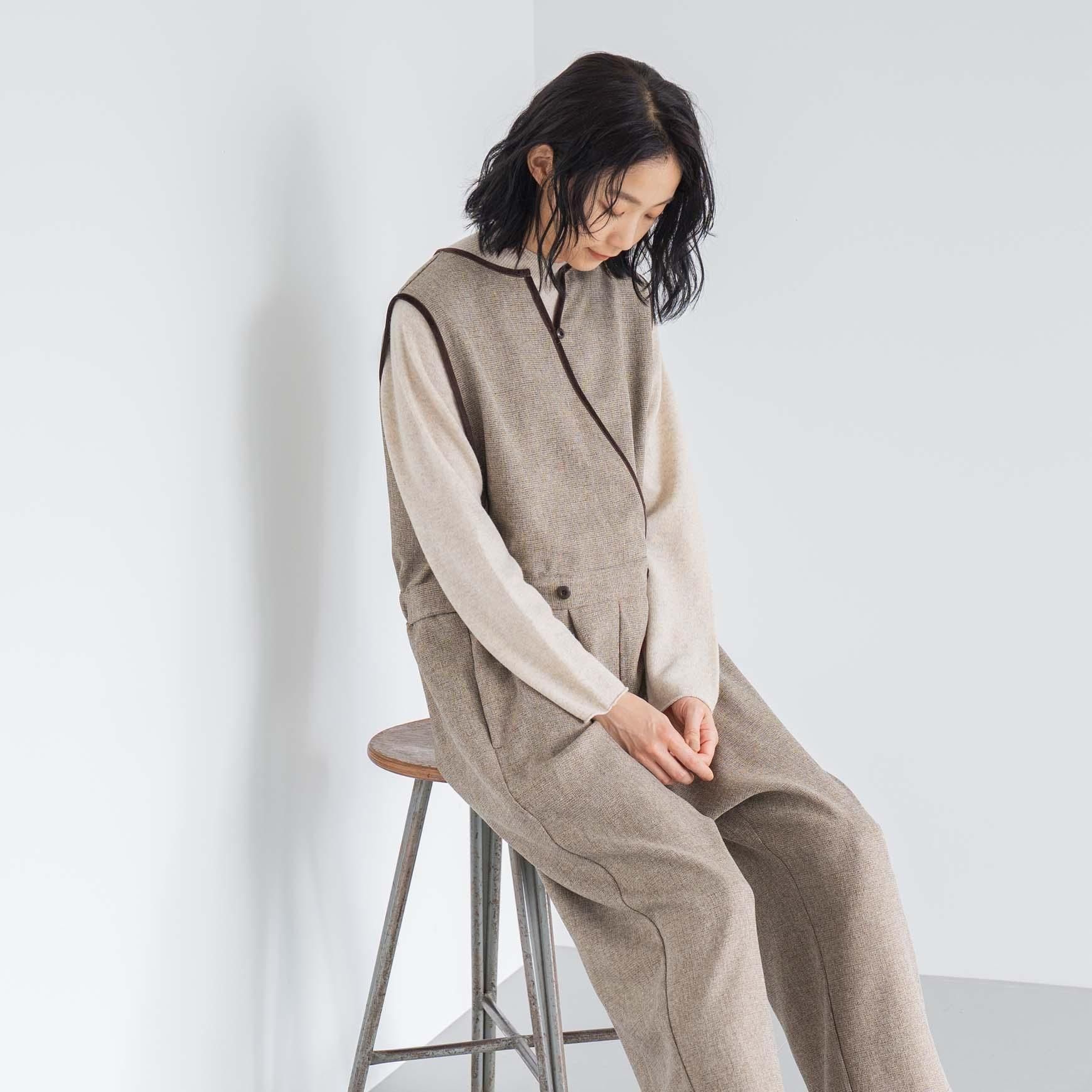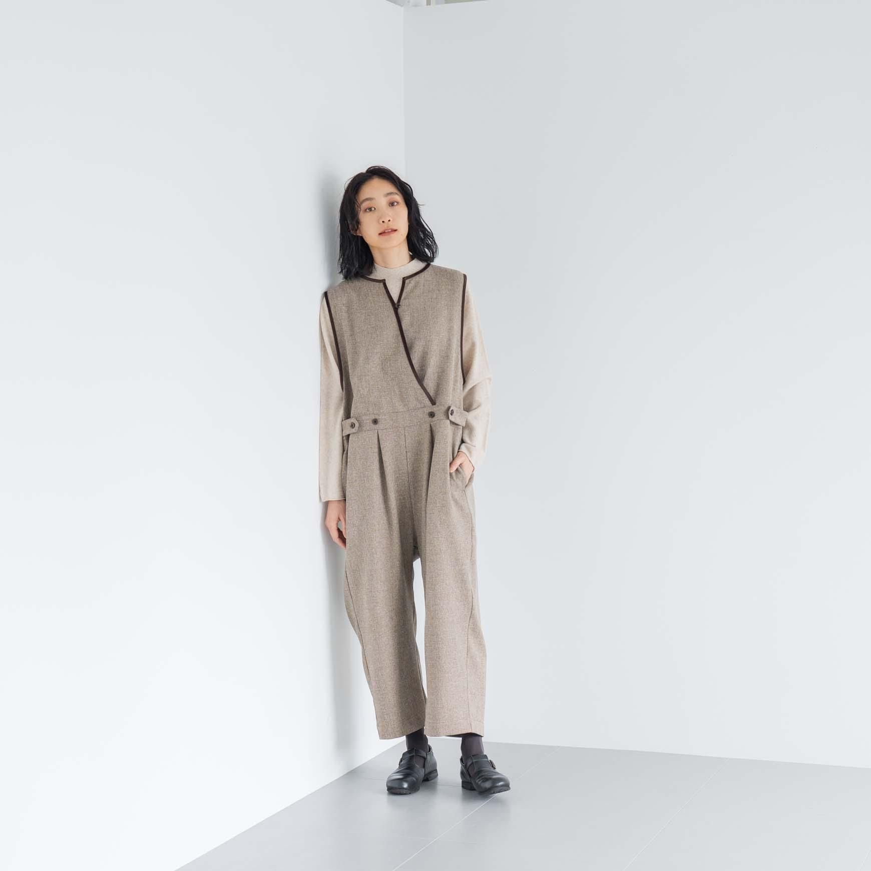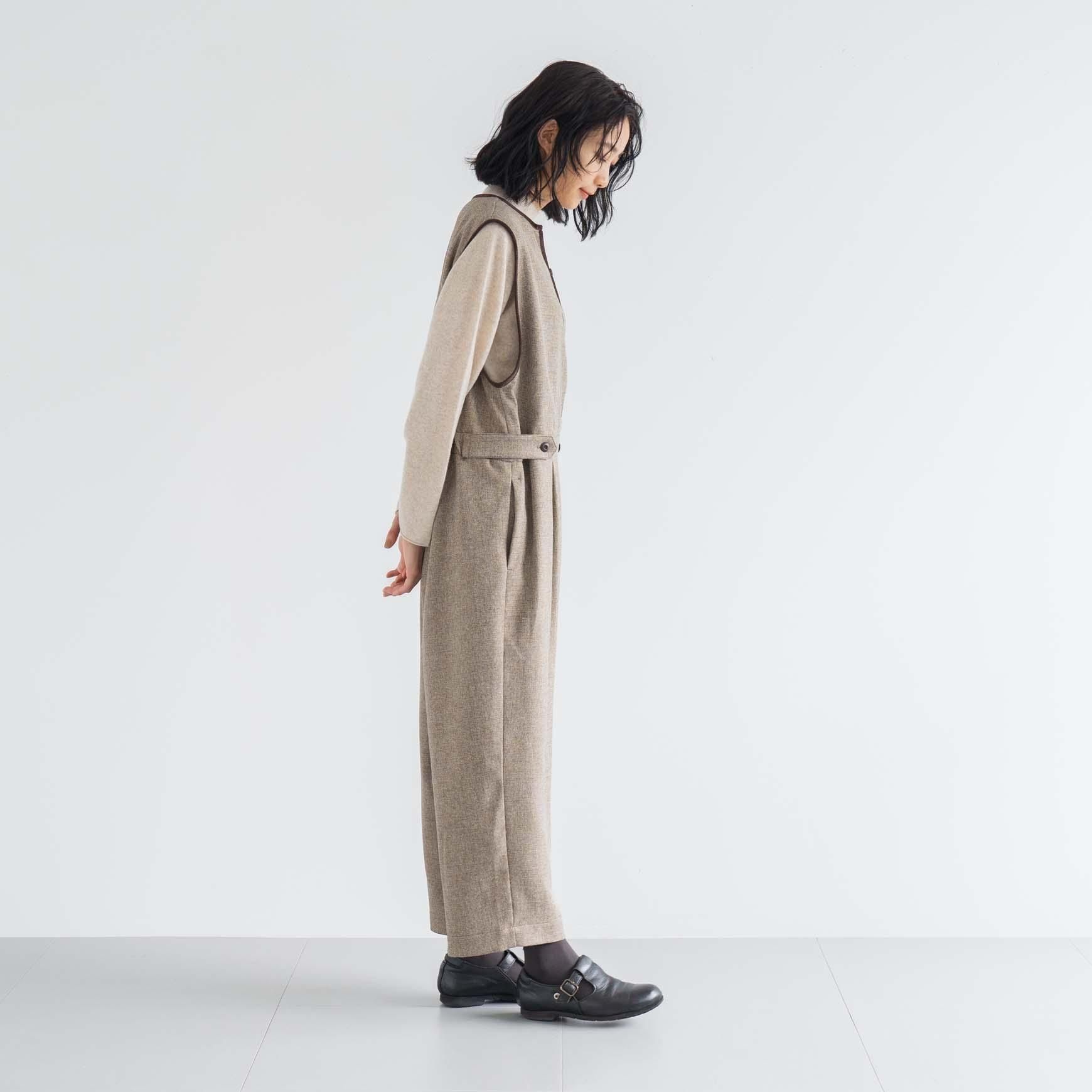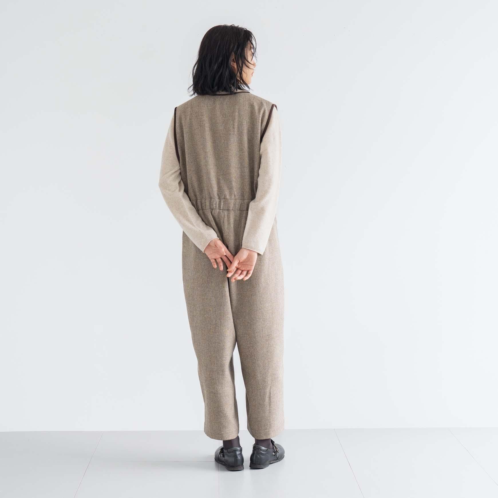 ツイード調のシックな素材で、リラックス感のあるサロペットパンツをつくりました。 素材とデザインのコントラストが楽しめる一着です。