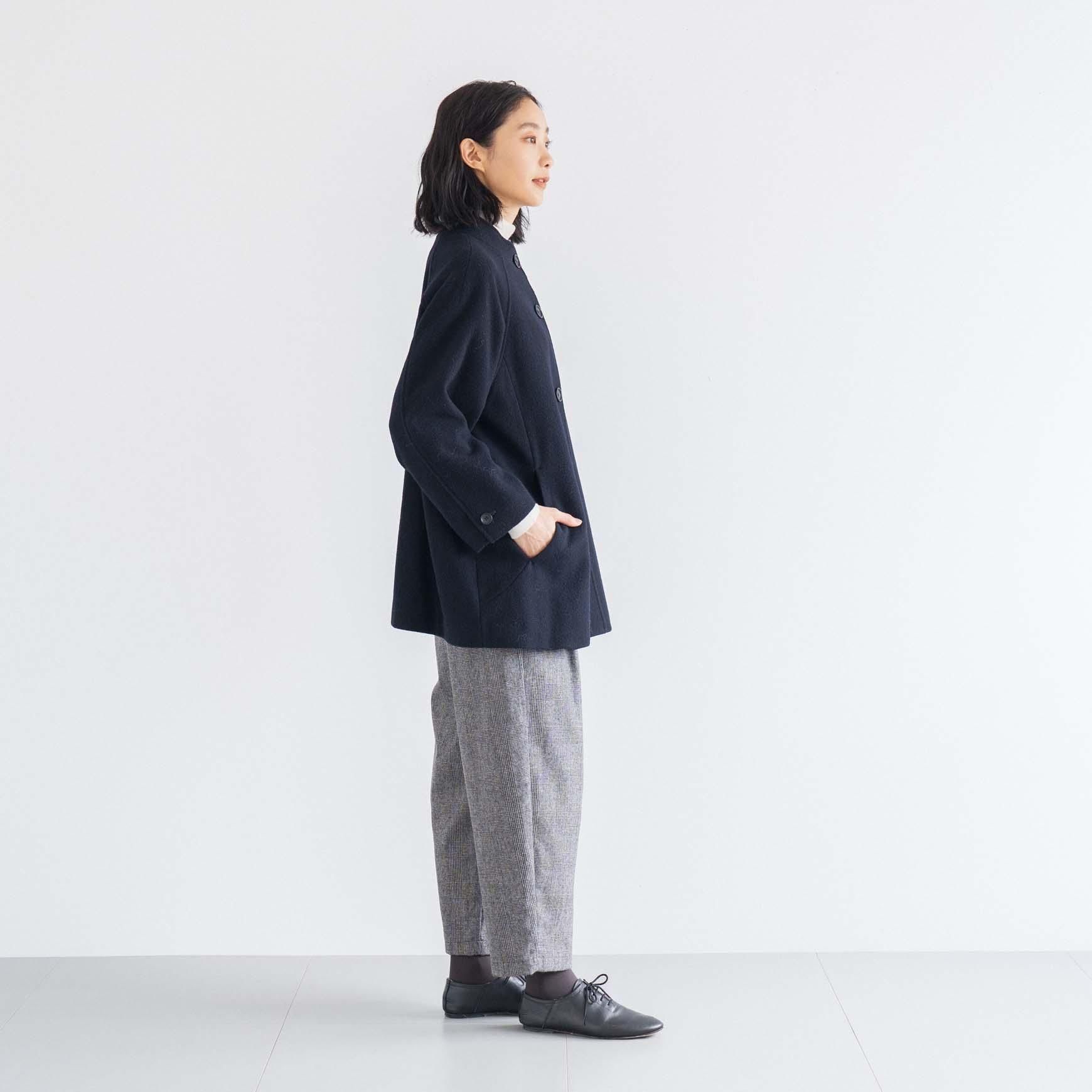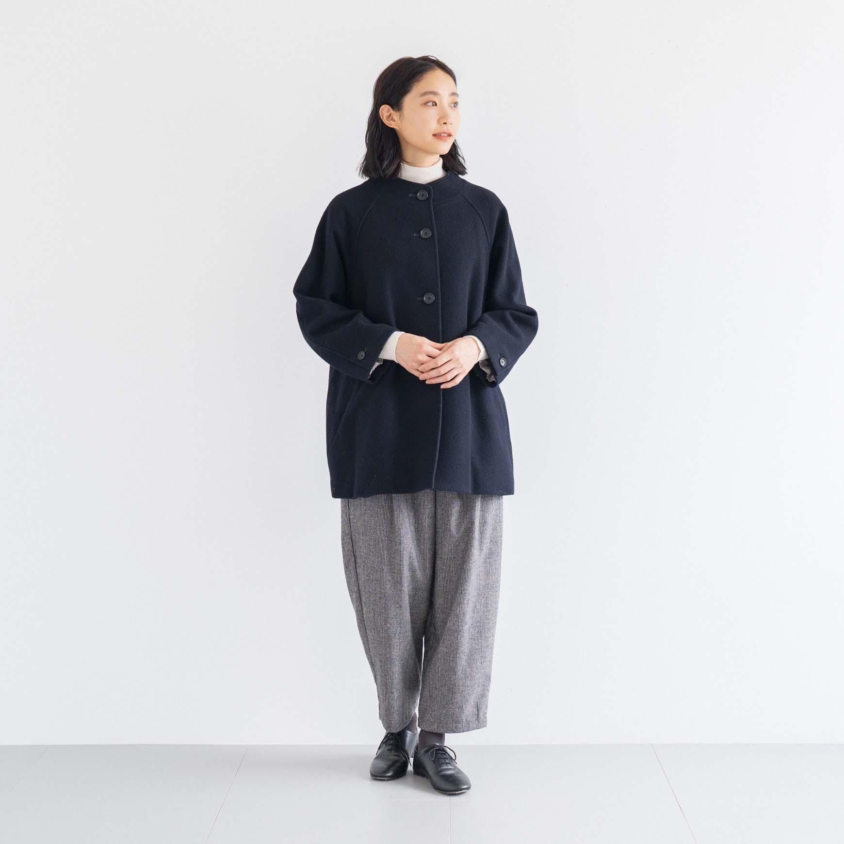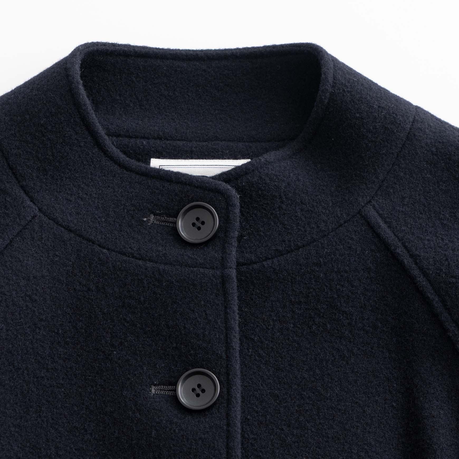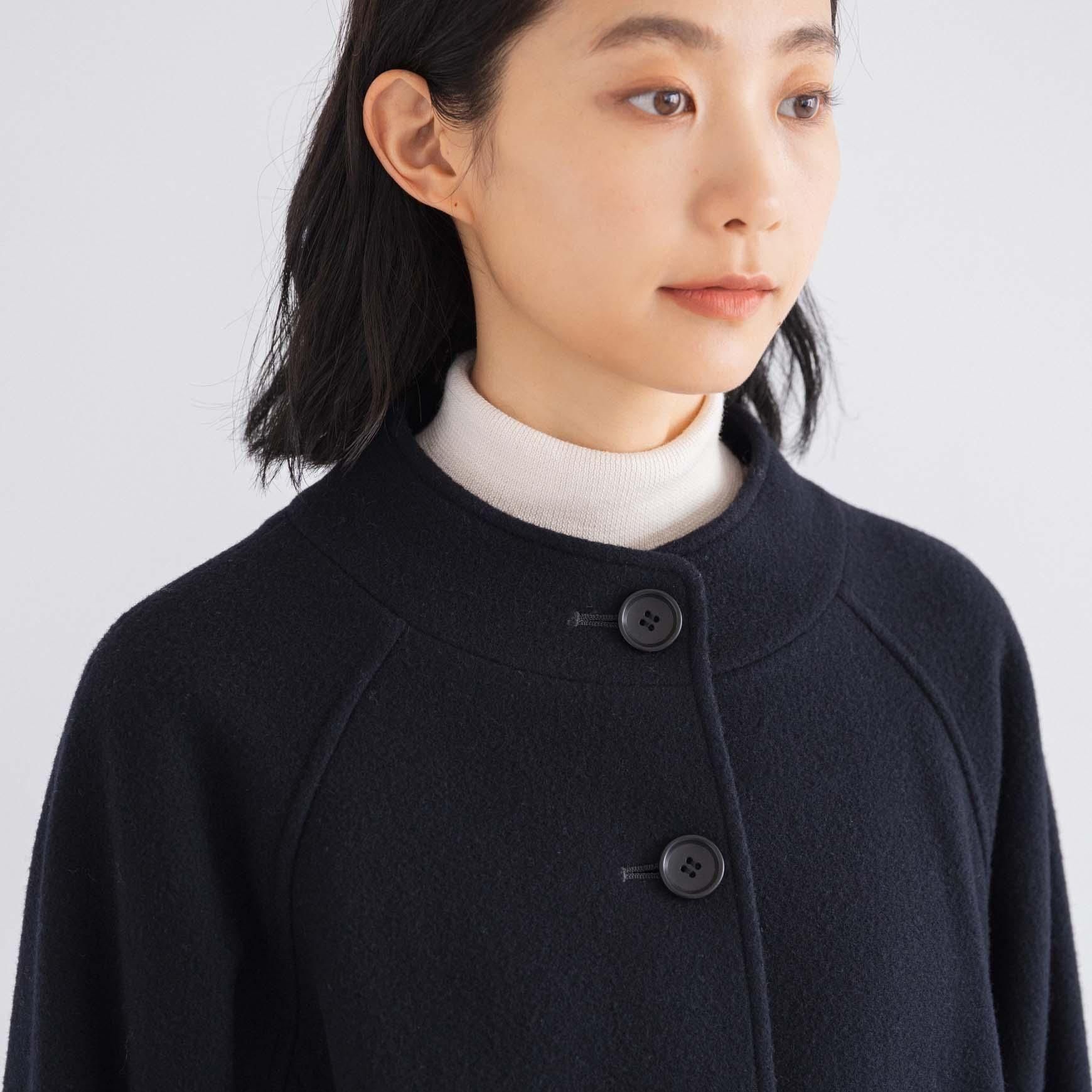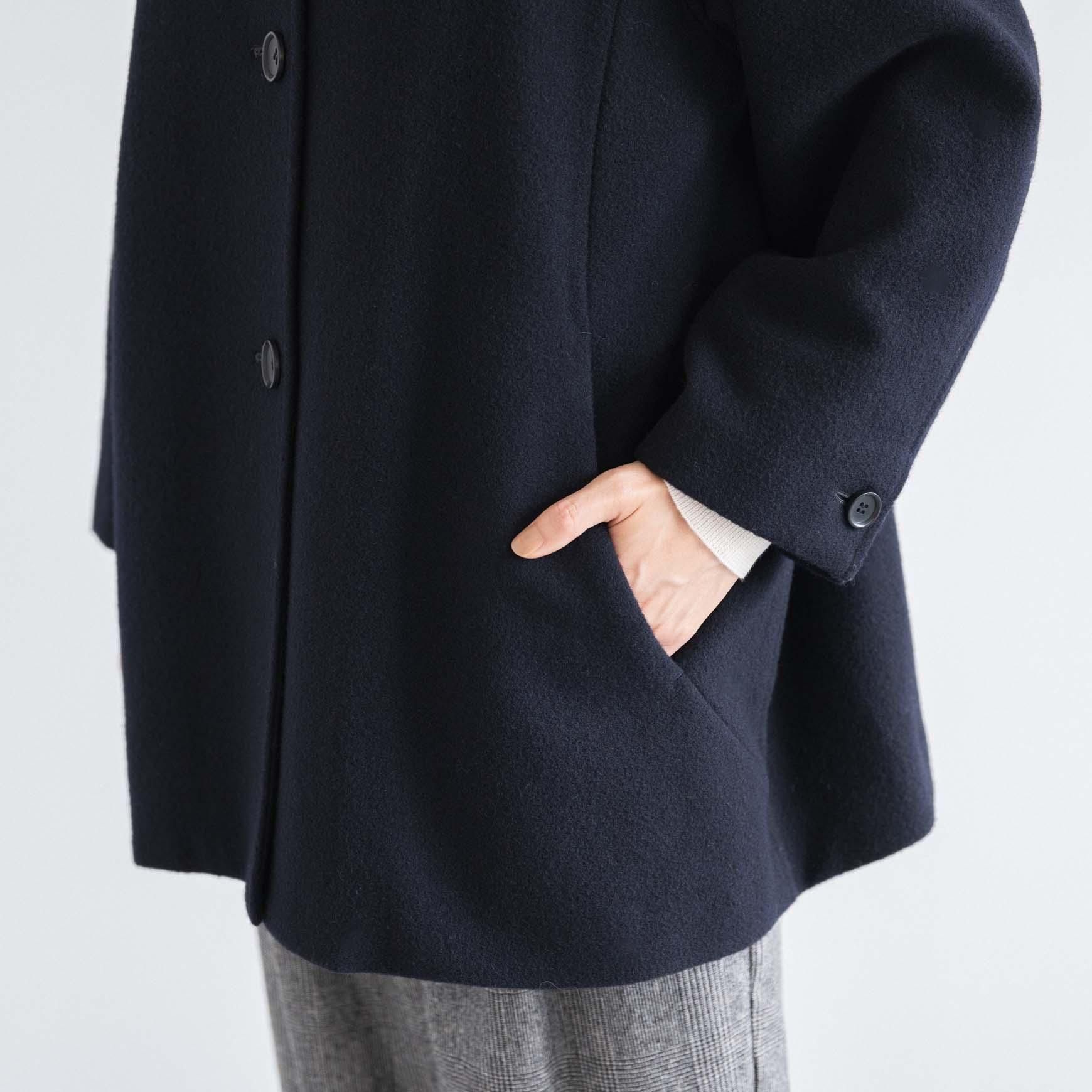 生地の軽さや丸みのある全体の柔らかい印象の中に、スタンドカラーのシャープさやシックな雰囲気が加わり、オンオフどちらのシーンにも使いやすいデザインのコートになっています。