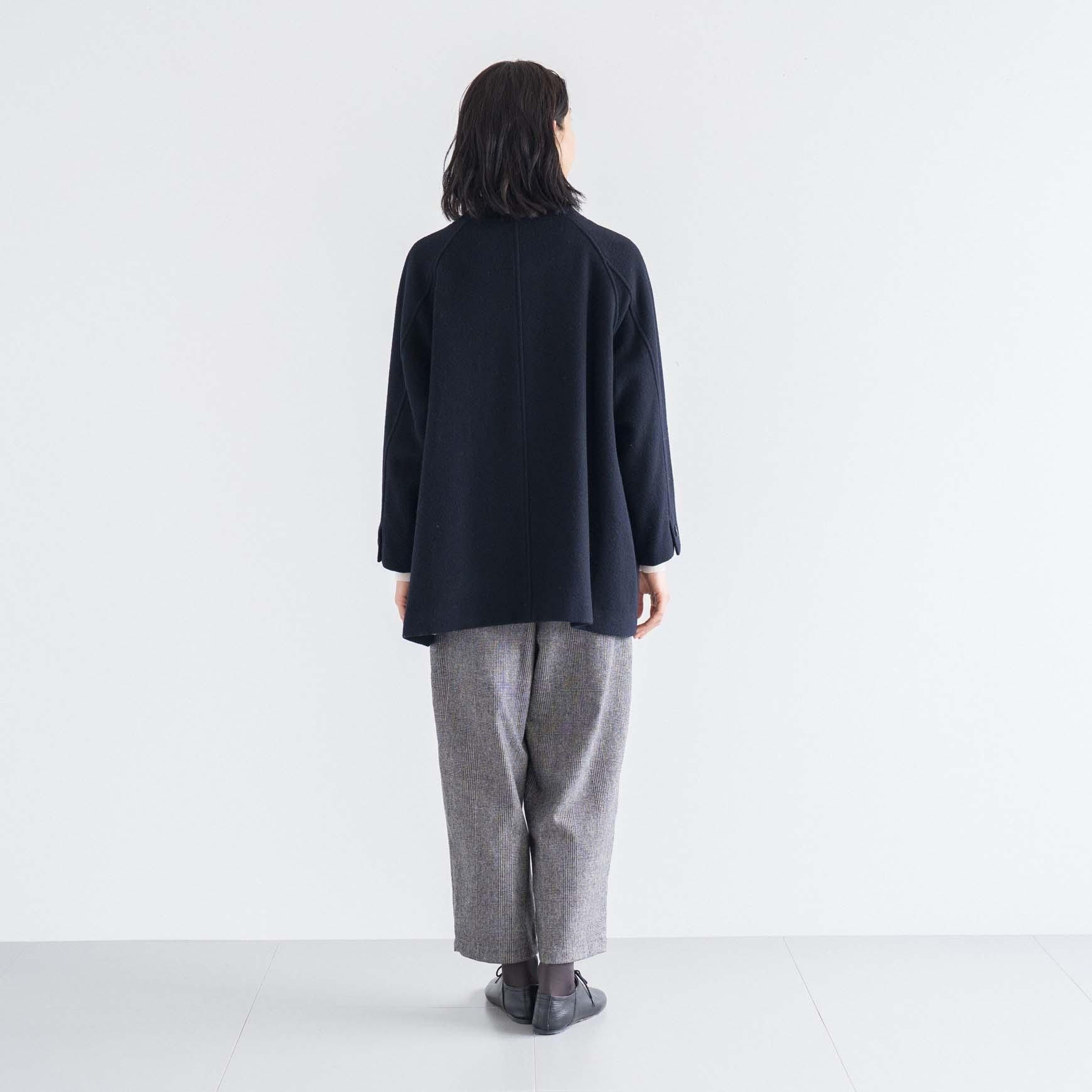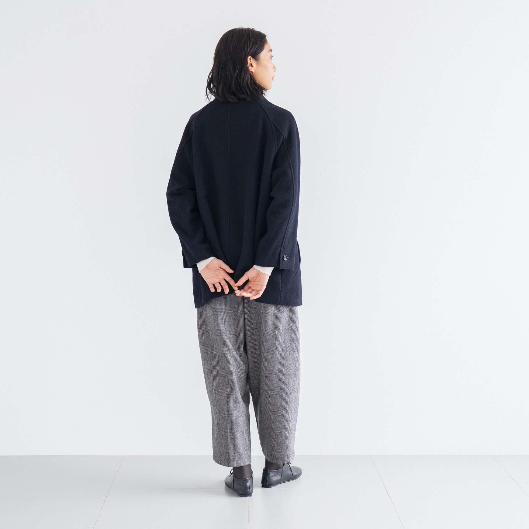 使用しているのは、オーストラリアのメリノ種を原料にした紡毛糸で織り上げた生地。 表面に起毛加工を施しフェルト化させた、ふんわりと暖かみを感じる風合いと保温性の高い生地感に仕上げました。