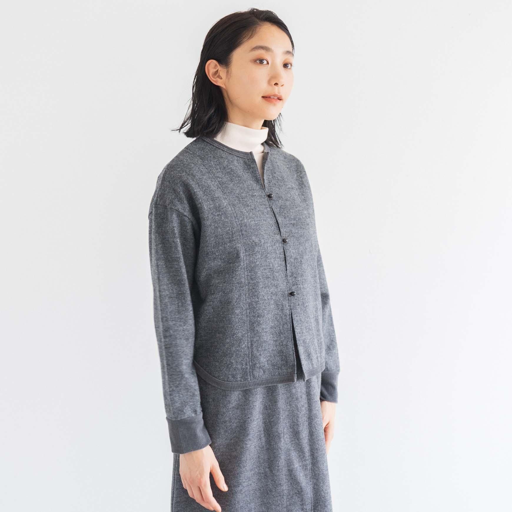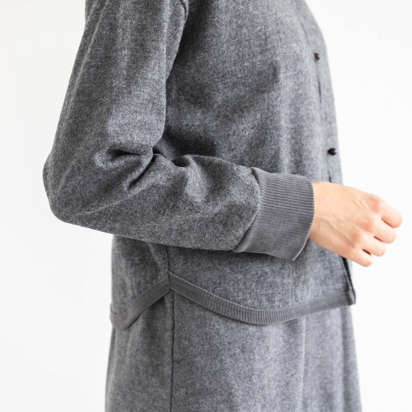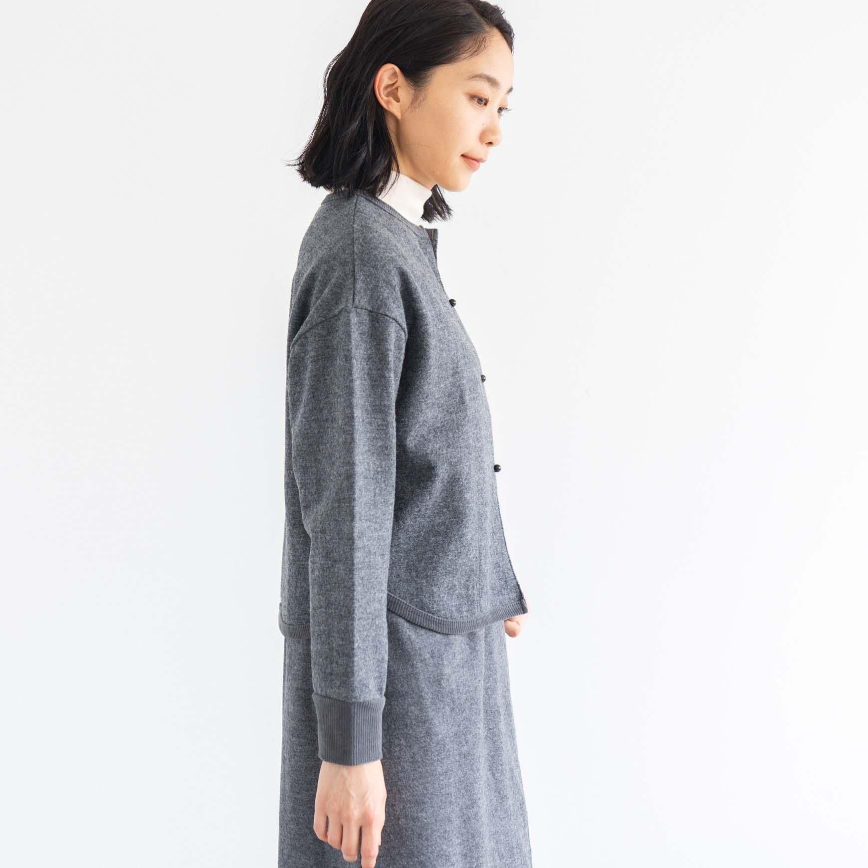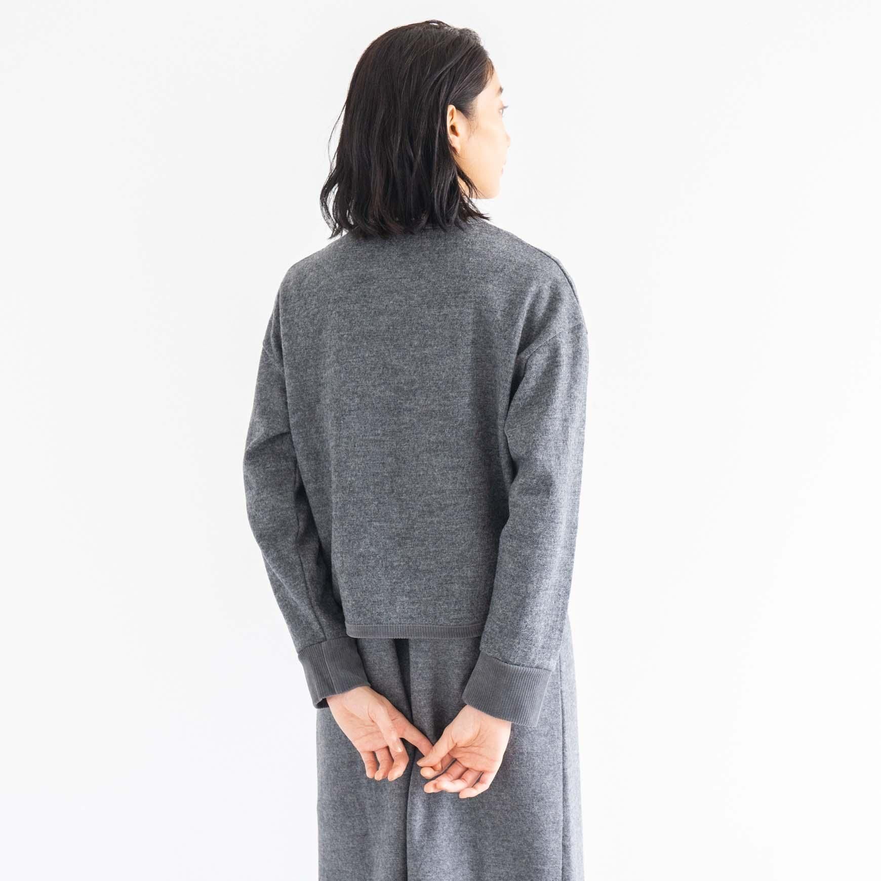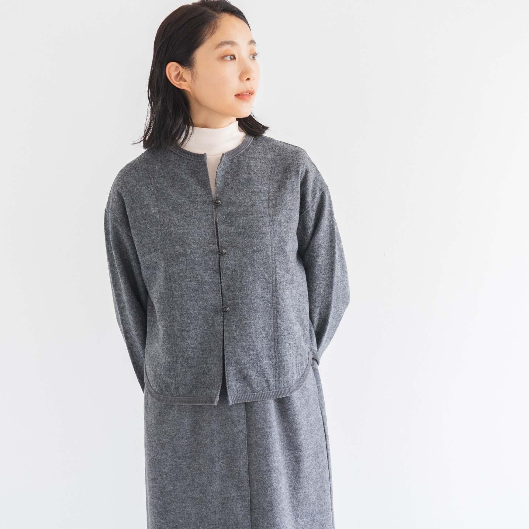 毛素材のニットを圧縮加工した生地で、織物のフラノ地のような上品さがありながら、伸縮性もありカジュアルな着用感が魅力です。