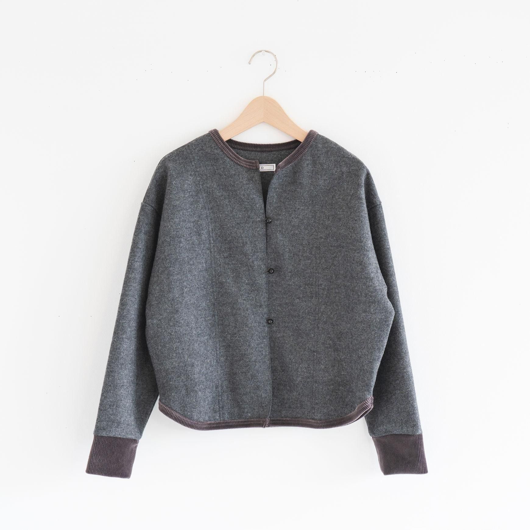 衿元や袖口にはコーデュロイ風の伸縮性のある生地を配して、アクセントにしました。