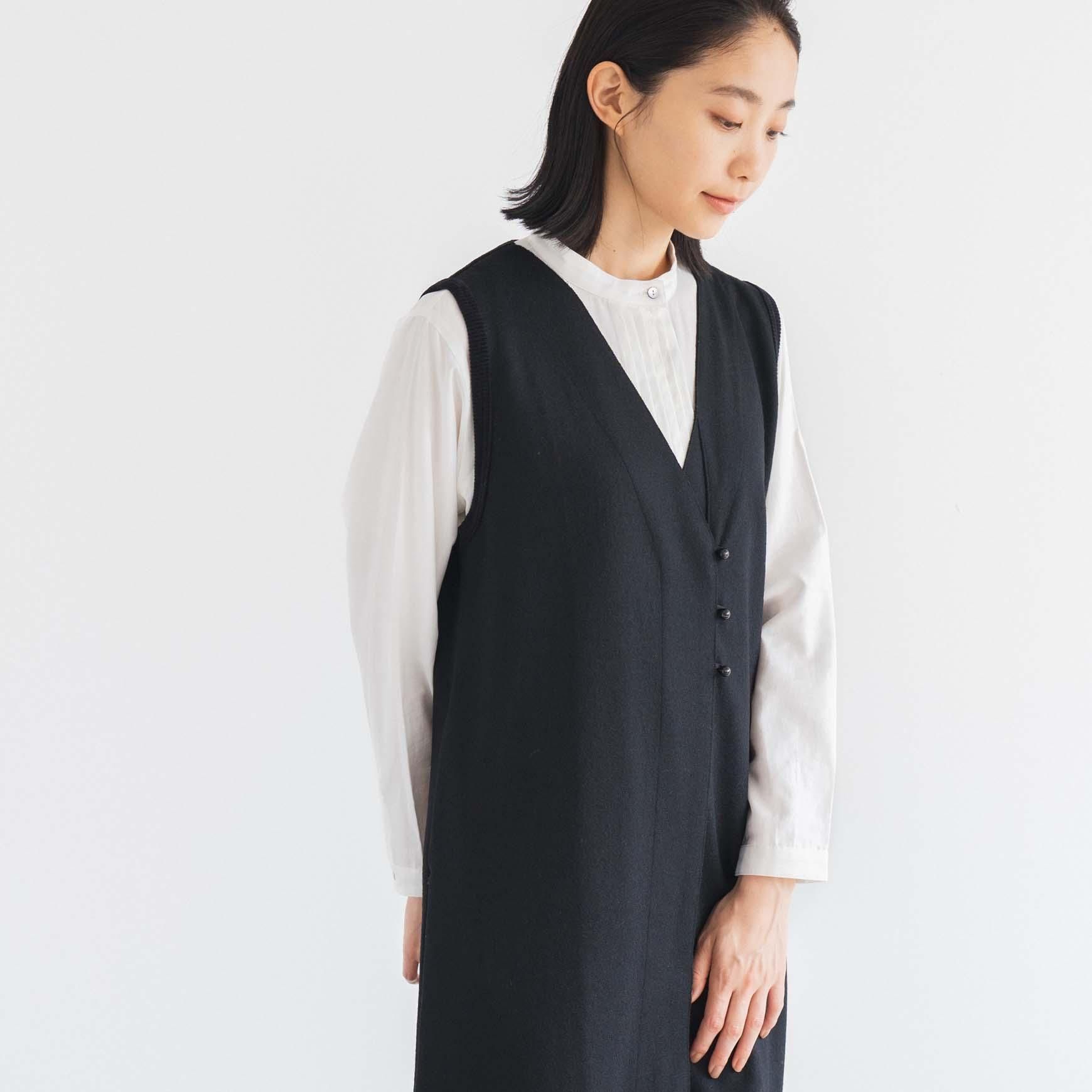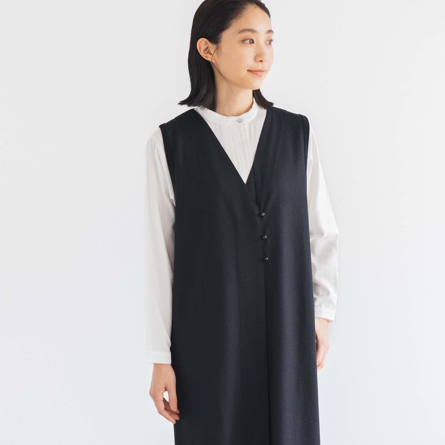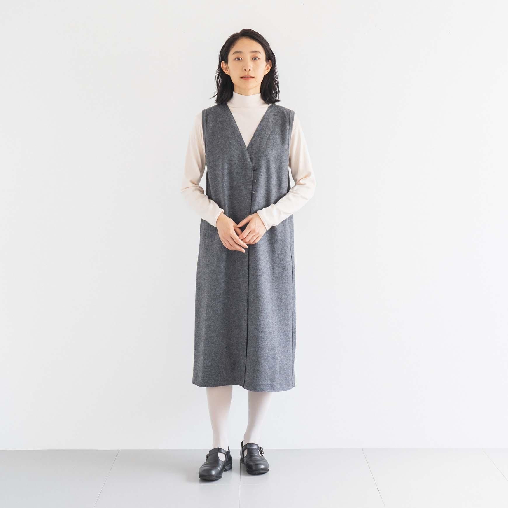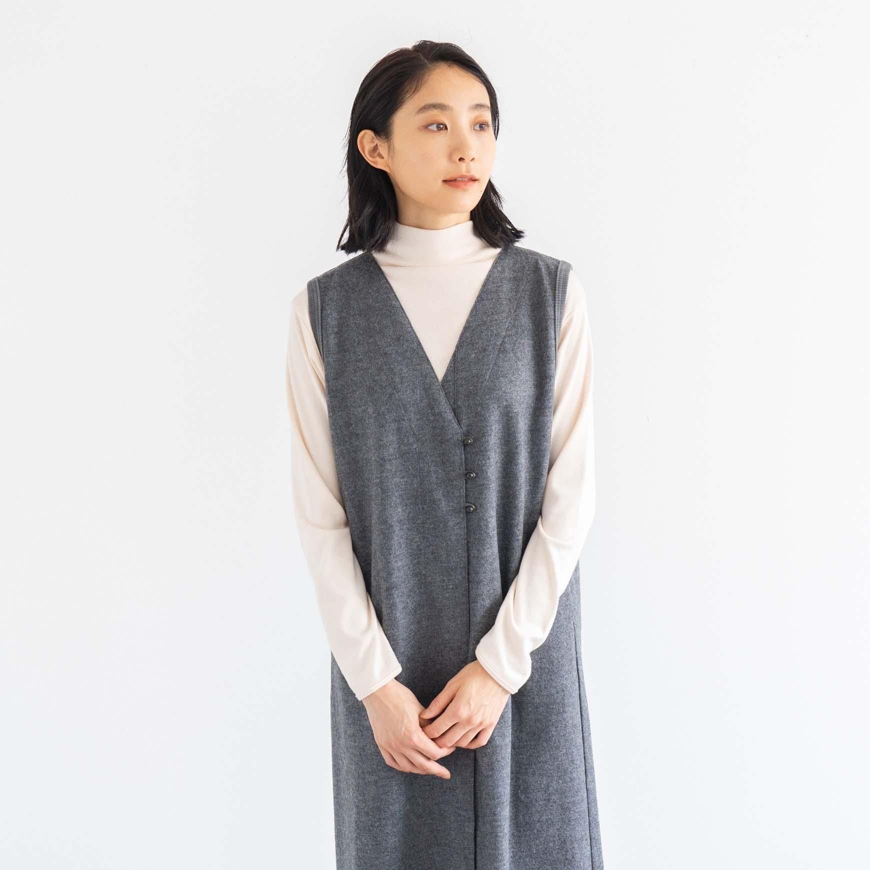 袖のないノースリーブのデザインは、合わせるインナーで温度調整がしやすいのも嬉しいところです。 秋口から春先まで長い期間着ていただけます。