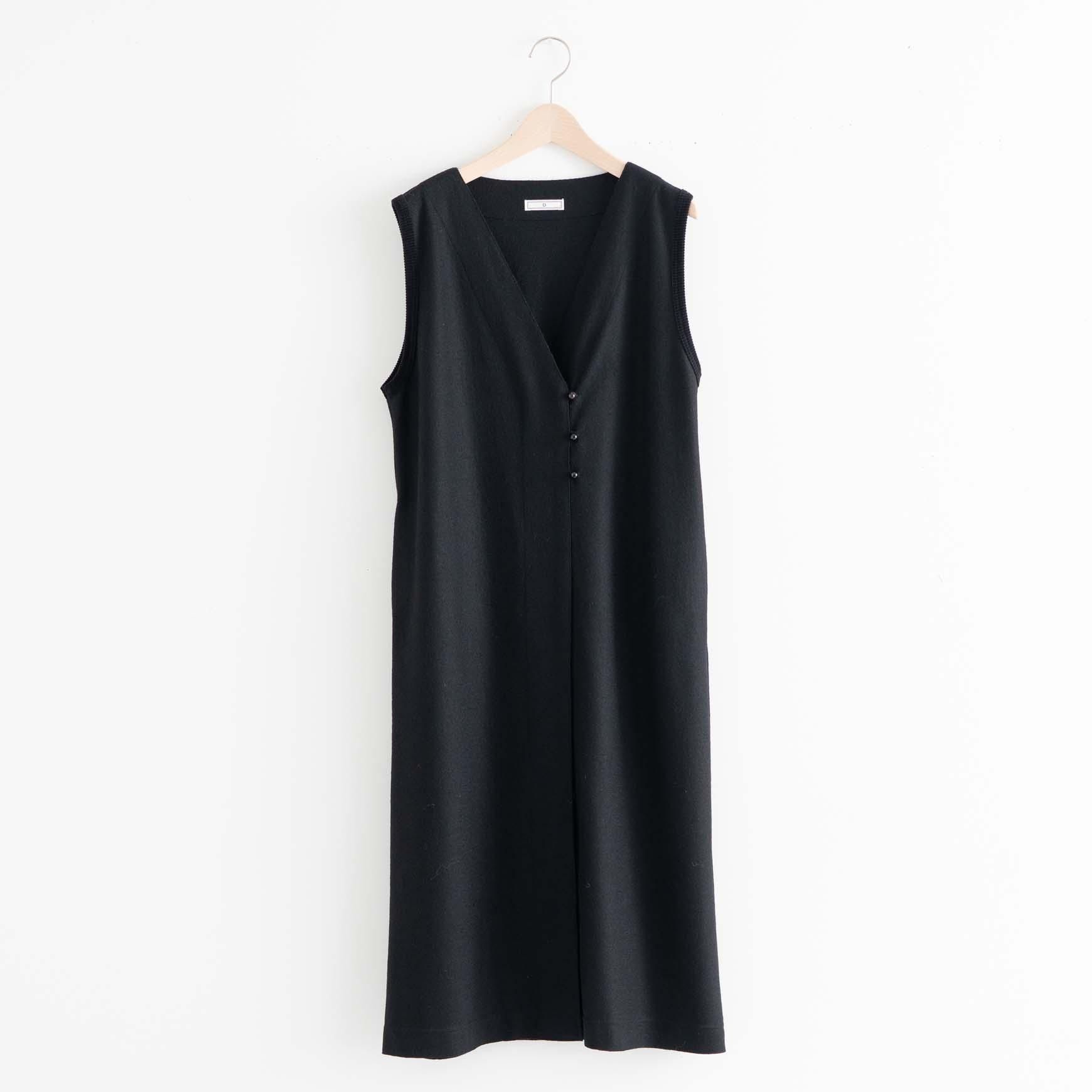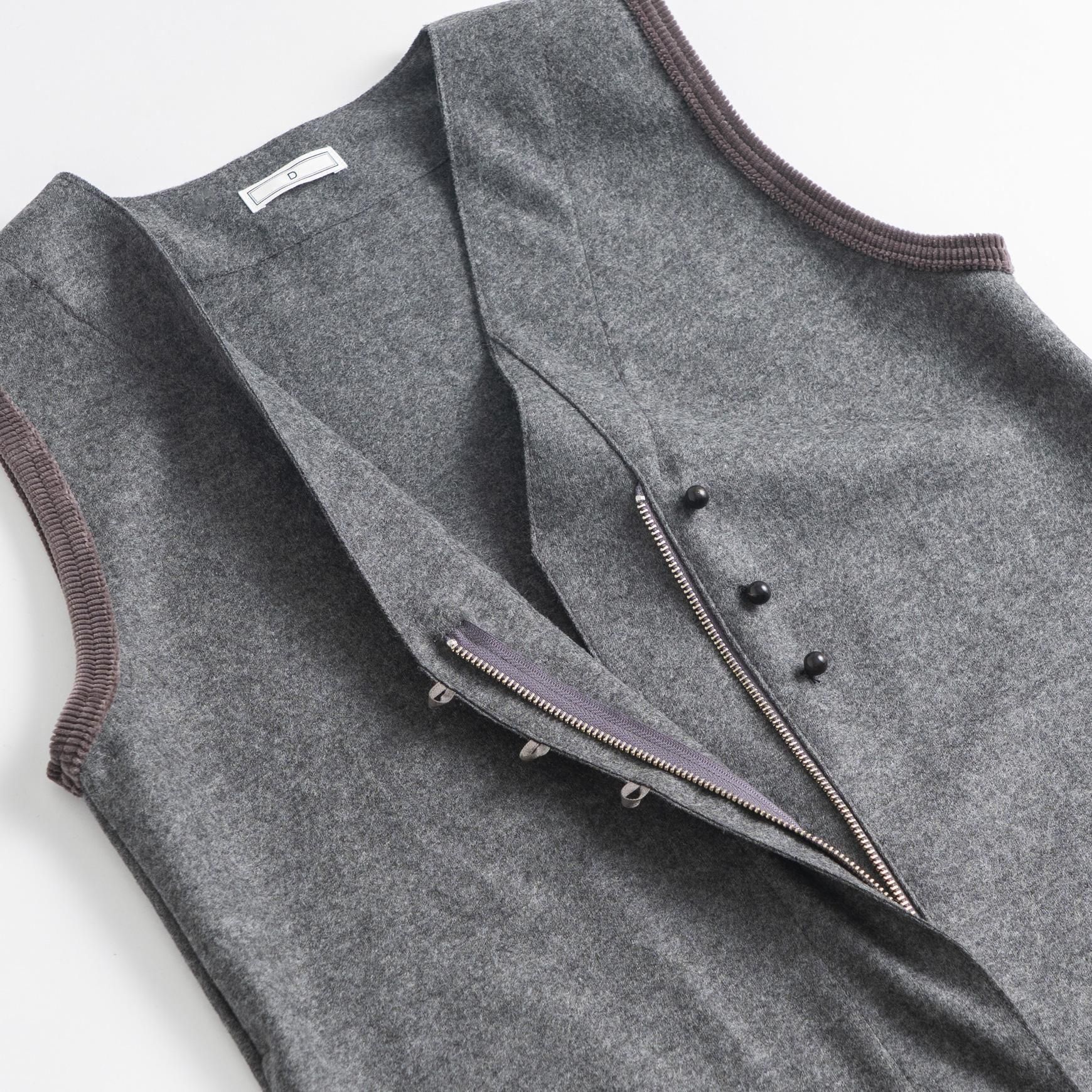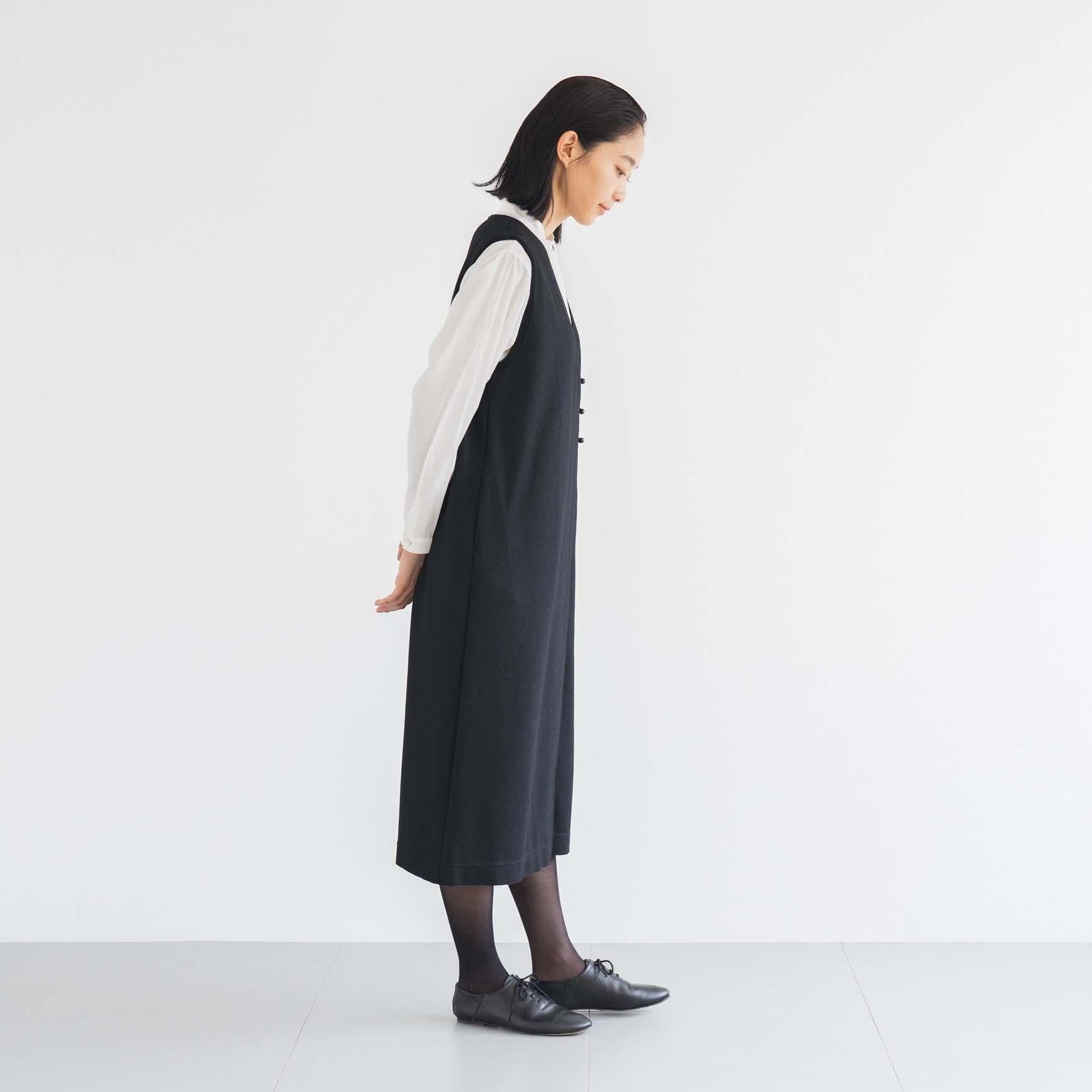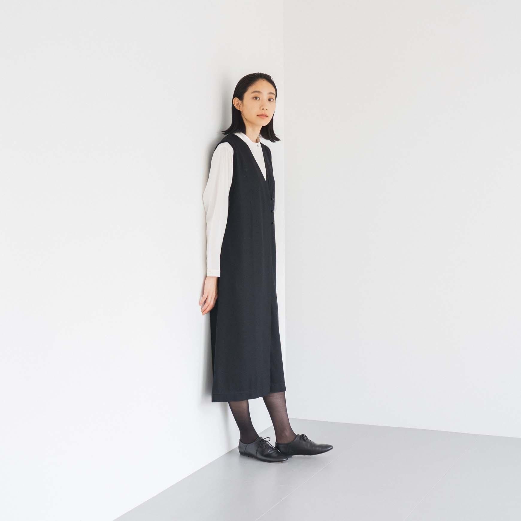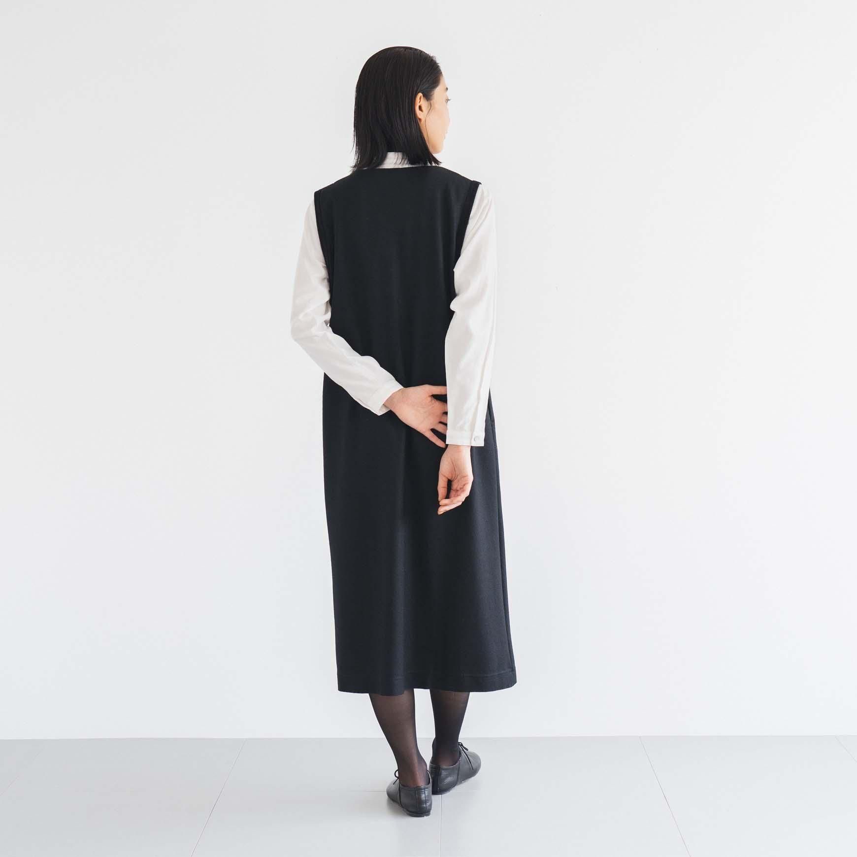 袖のないノースリーブのデザインは、合わせるインナーで温度調整がしやすいのも嬉しいところです。 秋口から春先まで長い期間着ていただけます。
