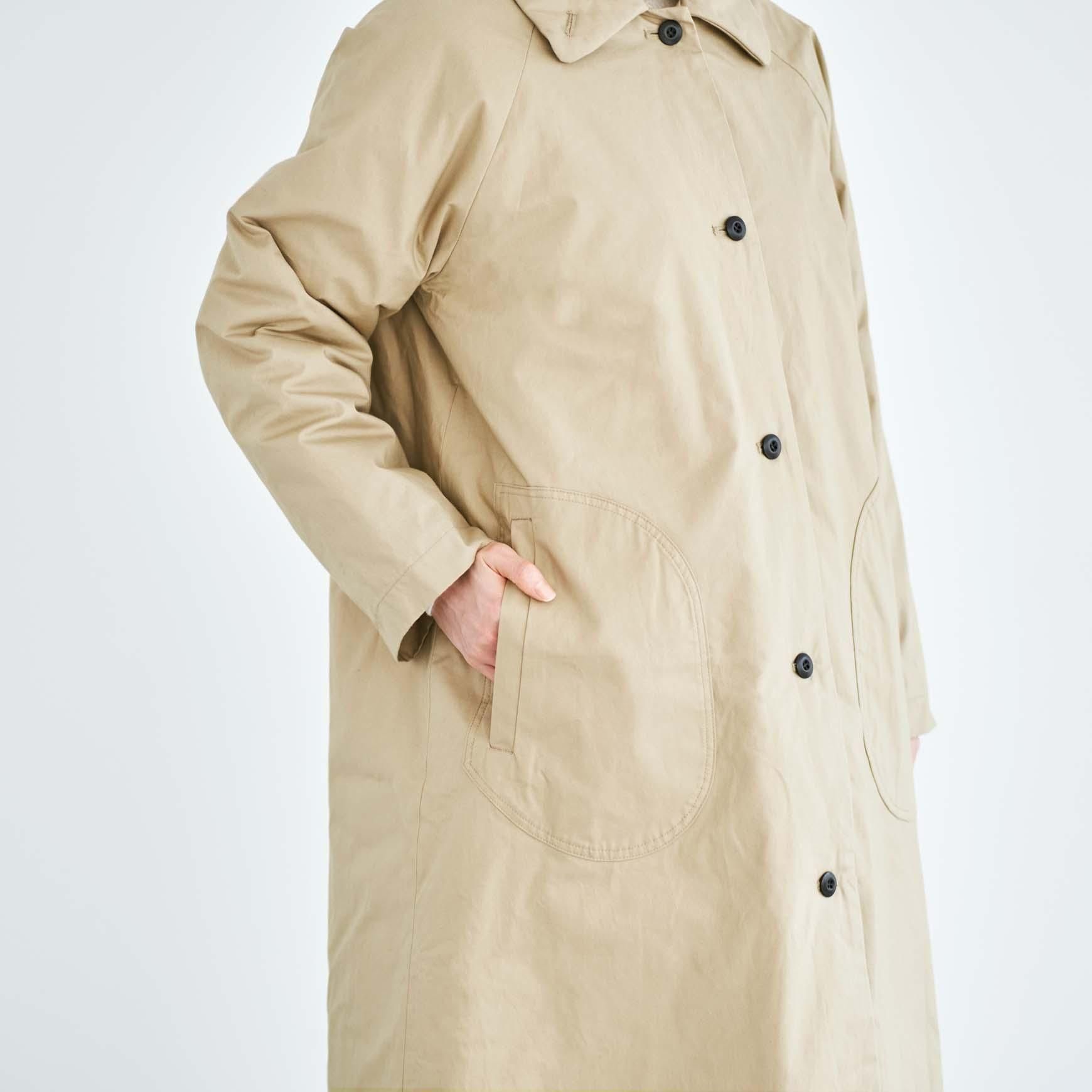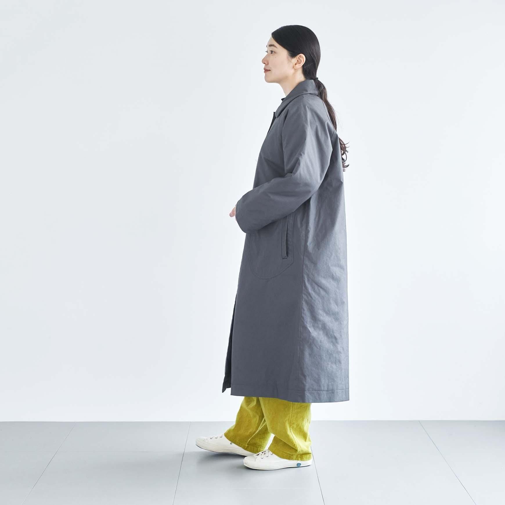 デザインは、シンプルな A ラインのステンカラーコート。