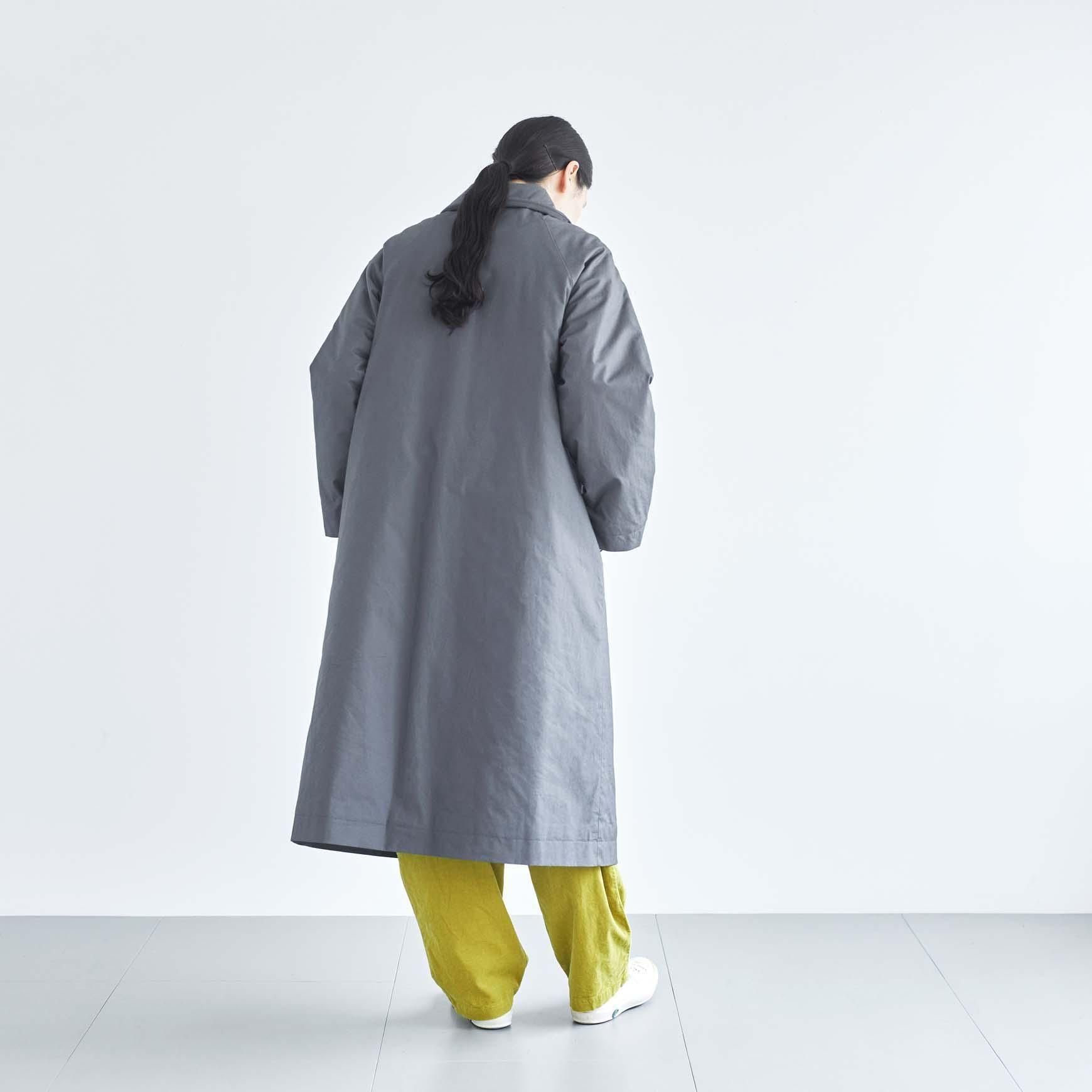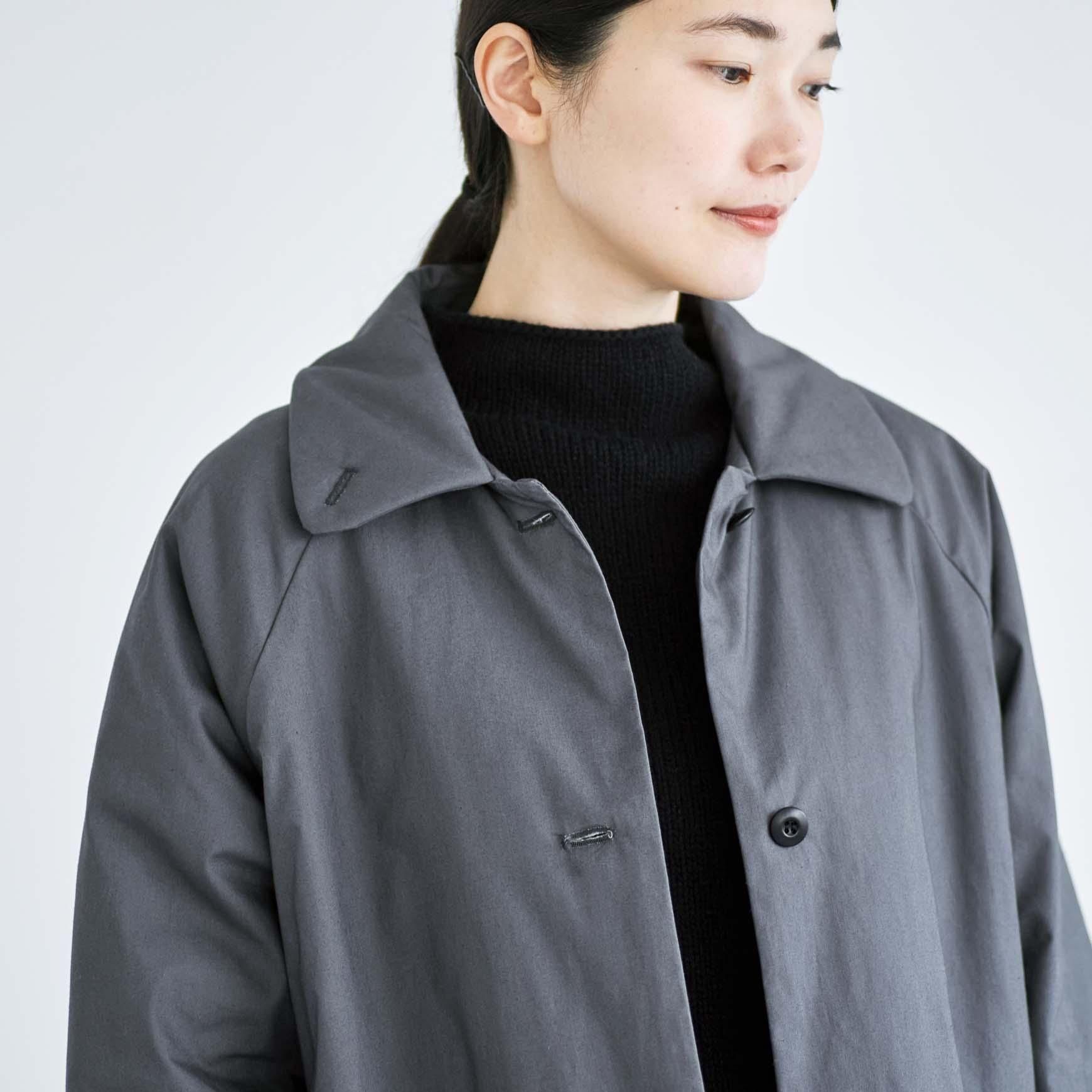 今季の新作コートは、中綿キルティングを裏地に施したステンカラーのロングコート。