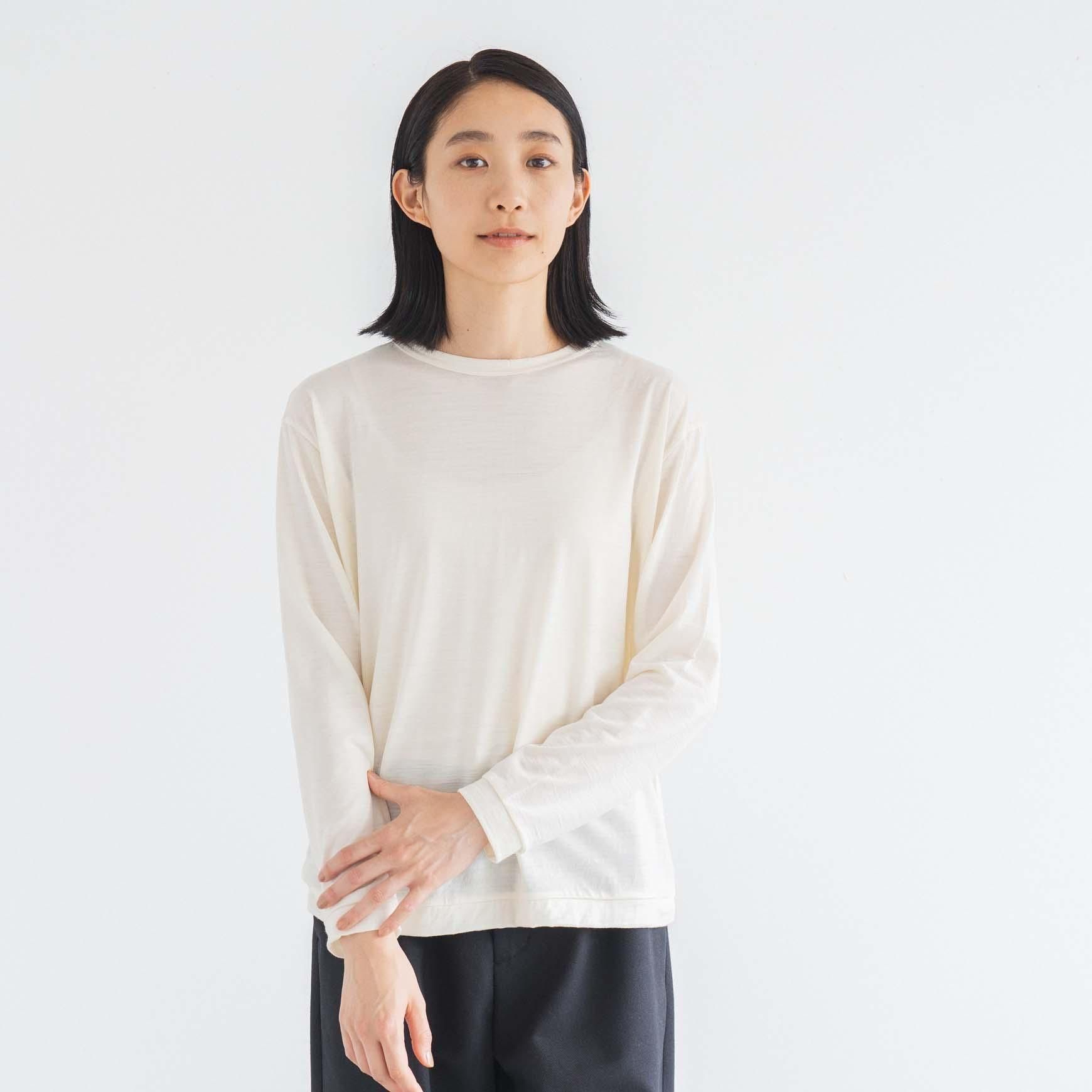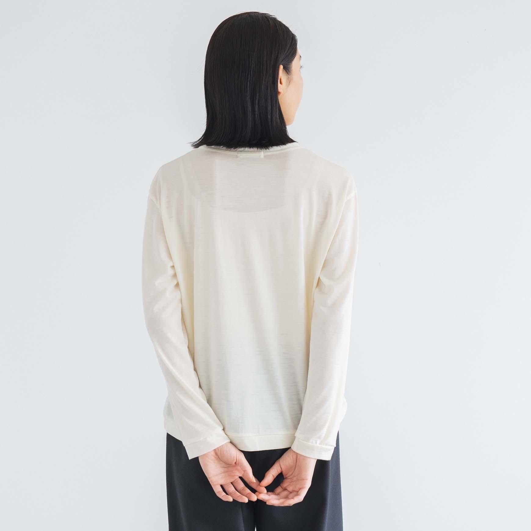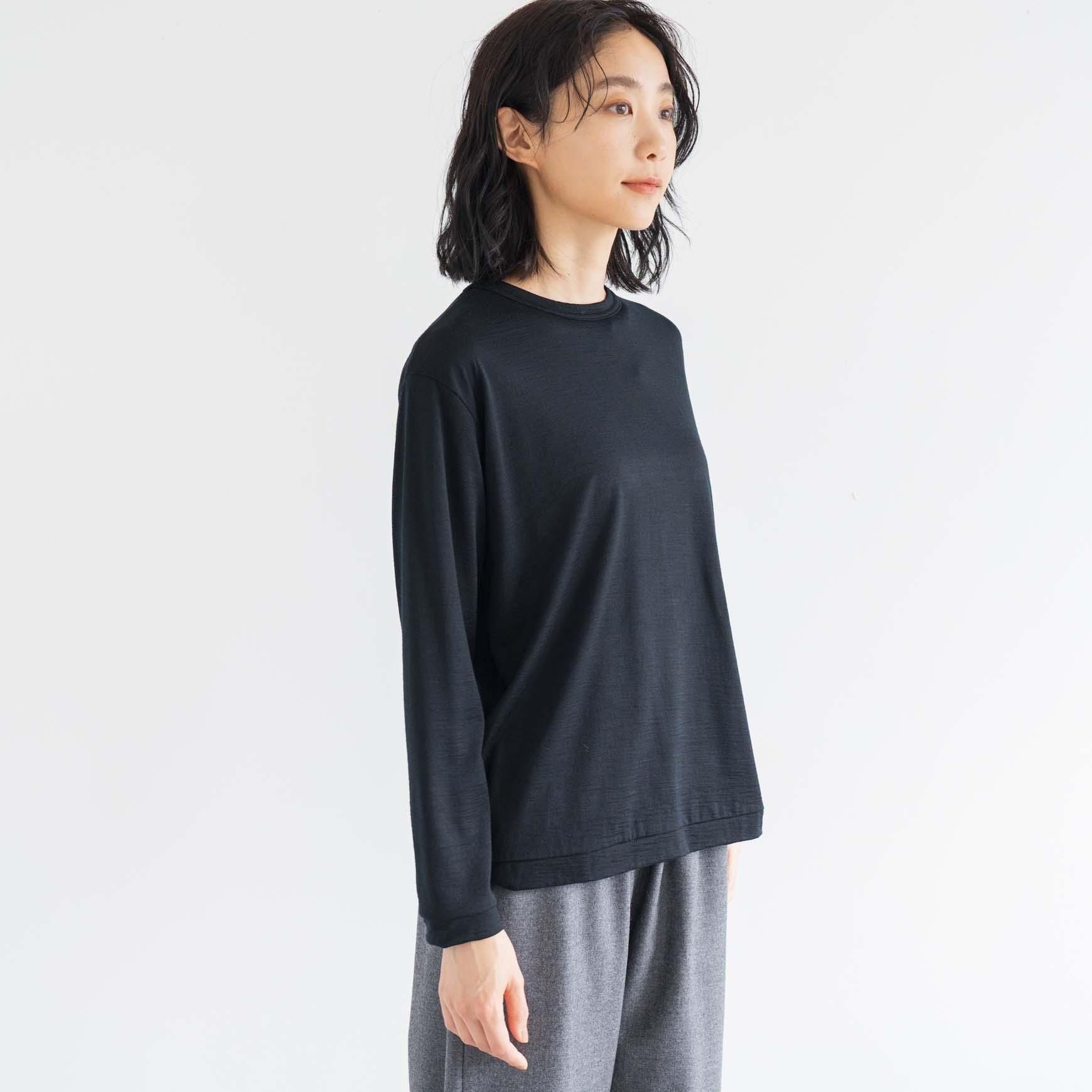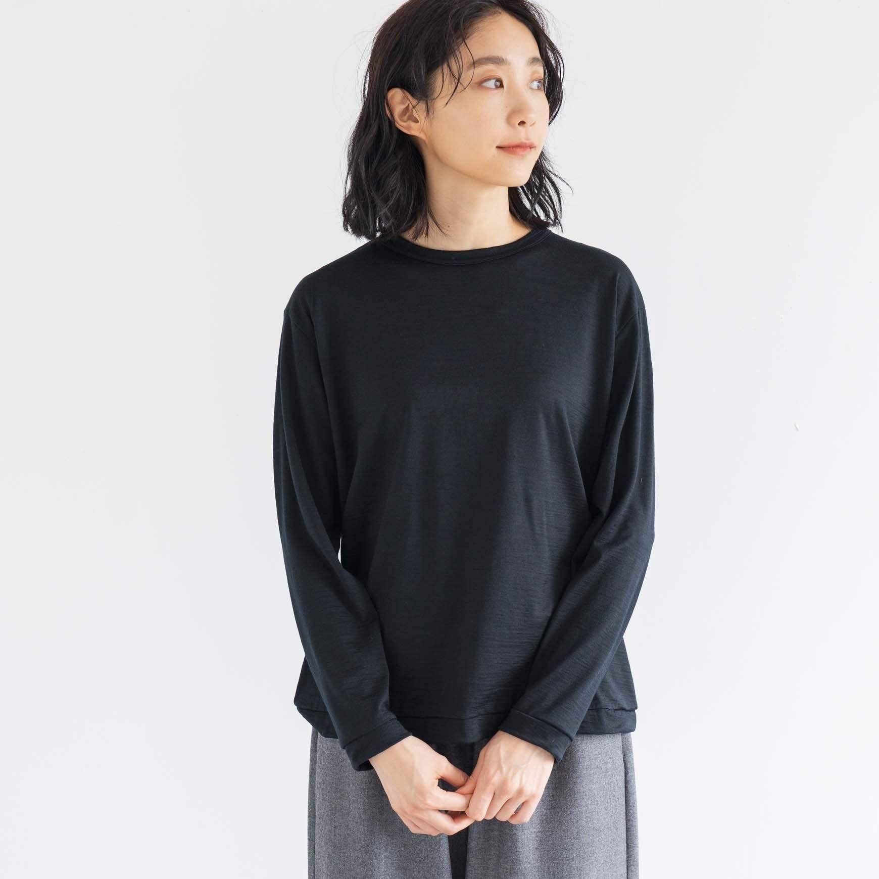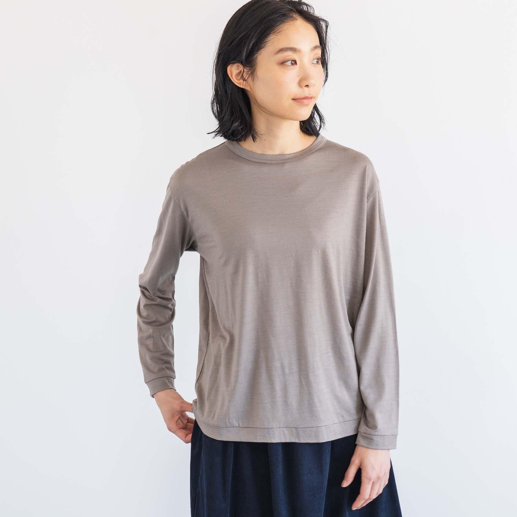 ウールなのに素肌に心地よく、1枚ではもちろんインナー使いにも、真夏をのぞいたほとんどの季節に使いやすいカットソーです。
