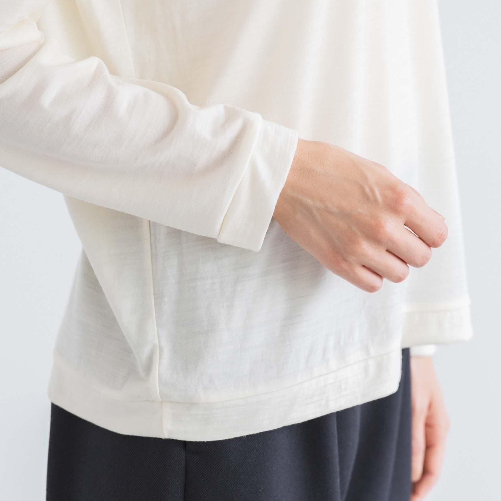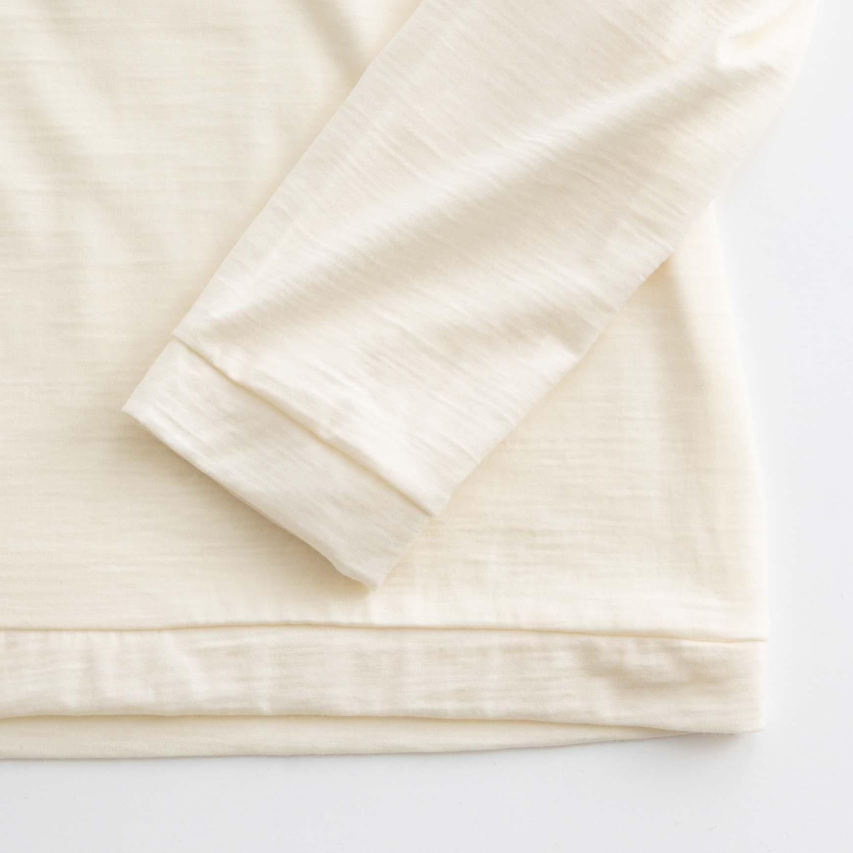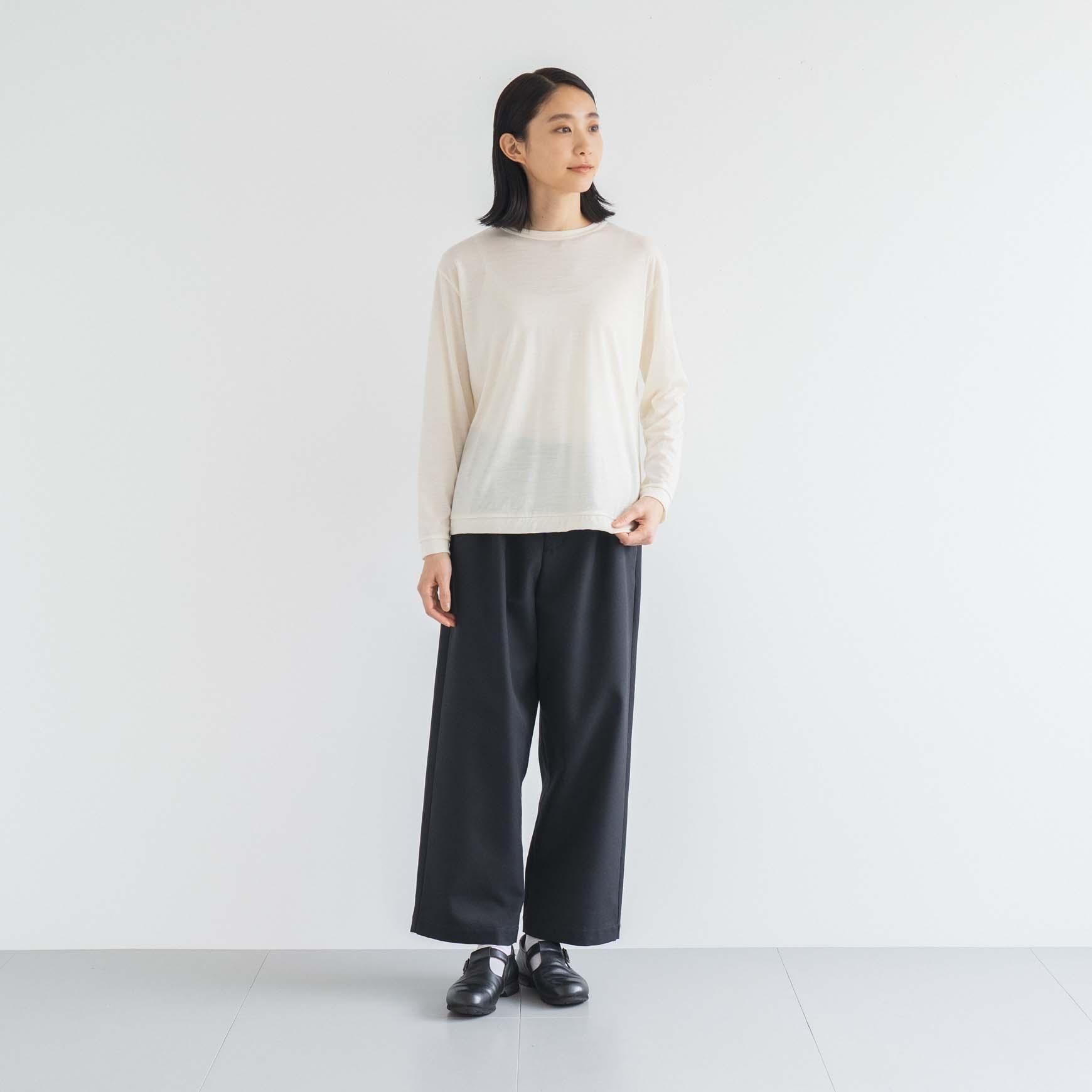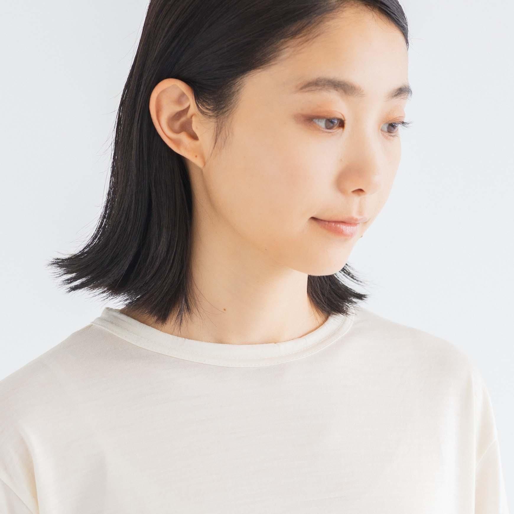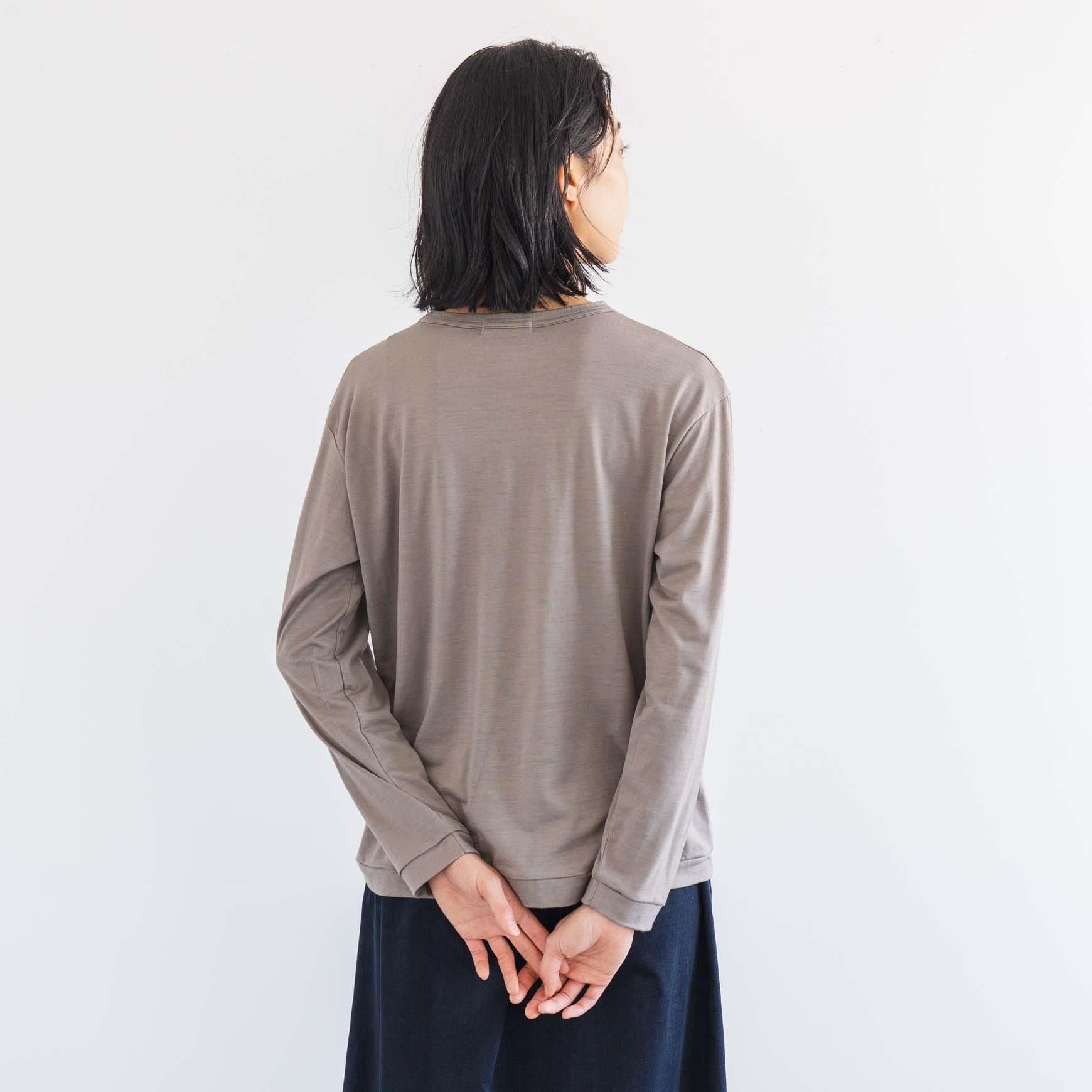 ウールなのに素肌に心地よく、1枚ではもちろんインナー使いにも、真夏をのぞいたほとんどの季節に使いやすいカットソーです。