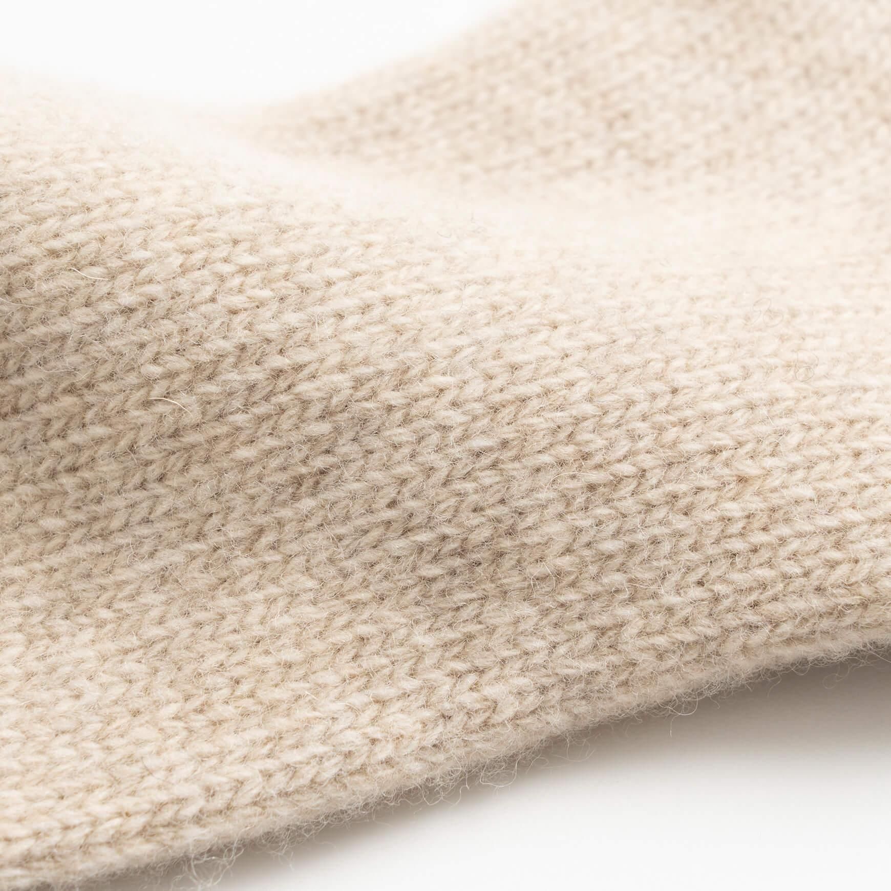 素材に使用されているラムズウール (Lambs Wool) とは、生後6か月前後のメリノ種の仔羊から刈り取られる羊毛のこと。 ラムズウールは繊維が細く、通常のウール混より軽く柔らかいのが特徴です。