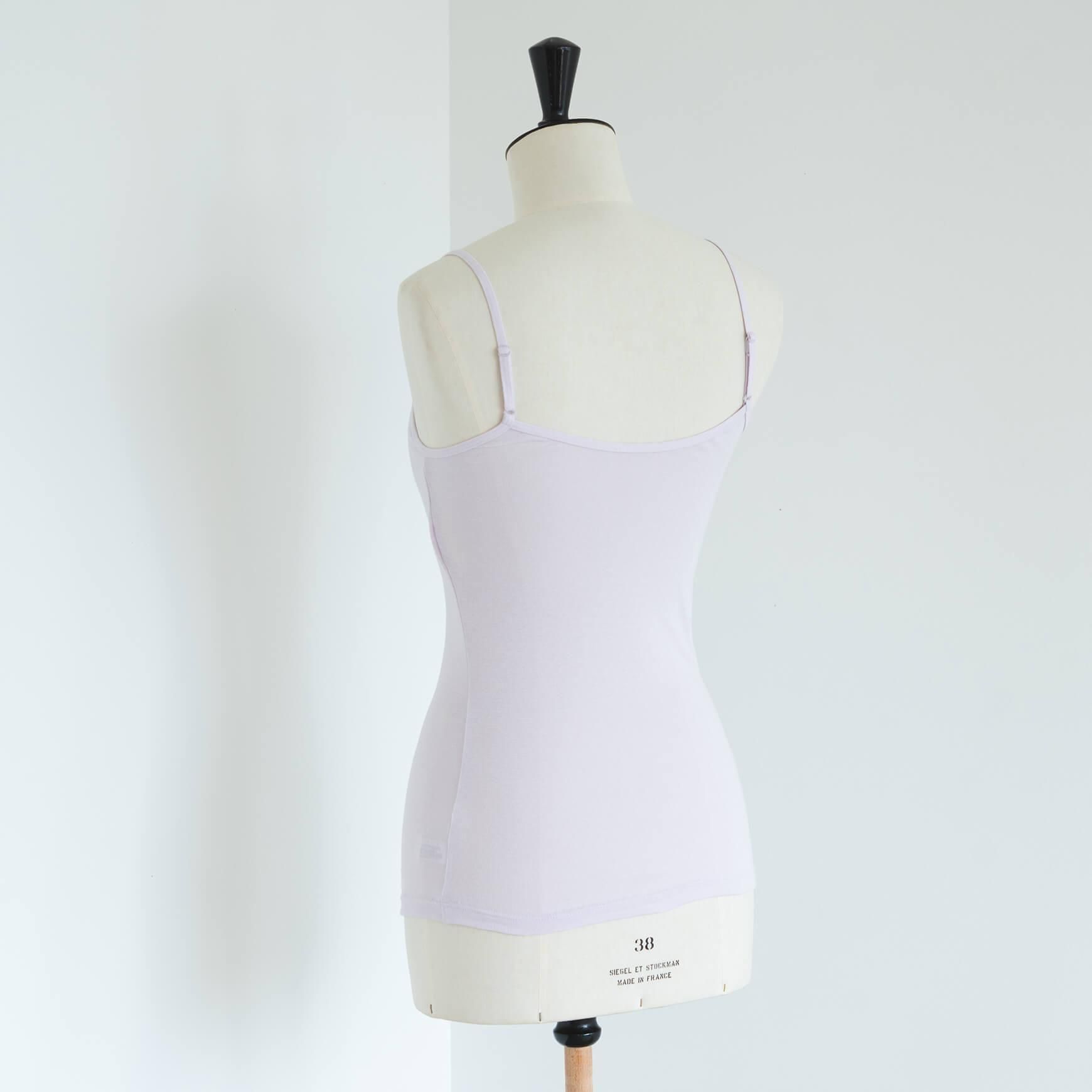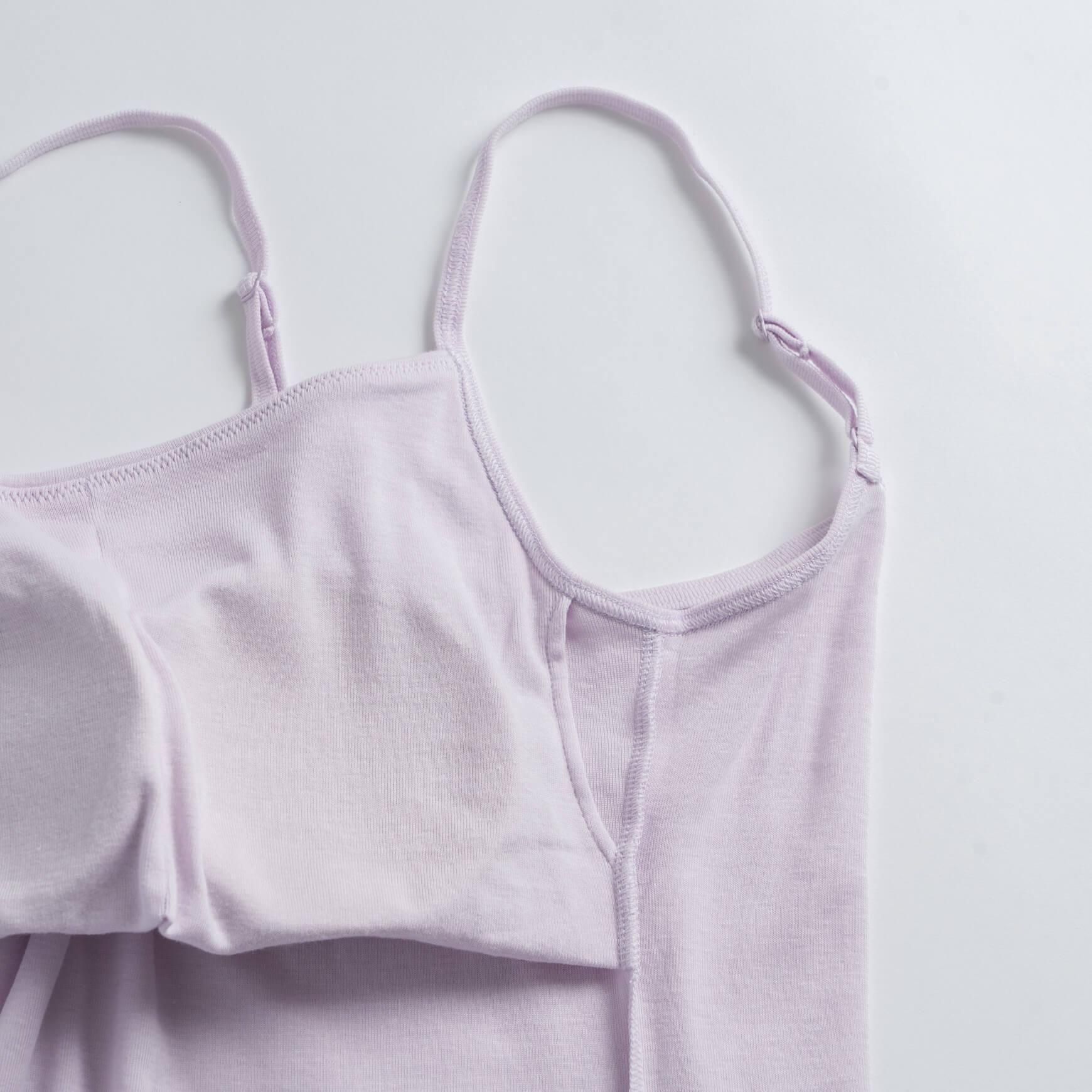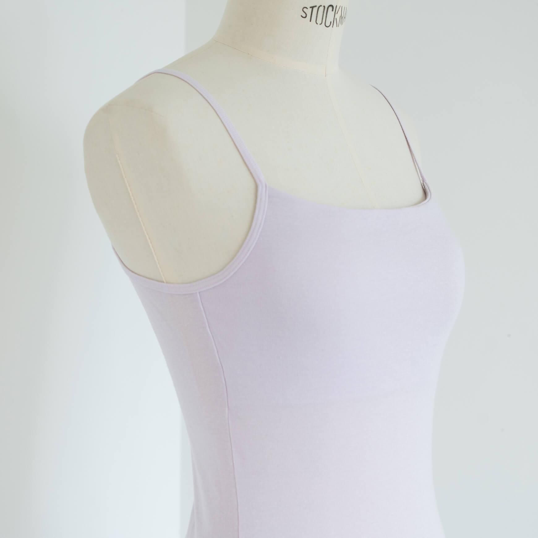 シンプルに見えるデザインにも、こだわりが詰まっています。ちらっと見えてもインナーぽく見えないように、フロントのデザインは、フラットに仕上げています。また、肩紐も身生地と同じコットンシルクを使用。 化繊のストラップが苦手な方にも安心です。