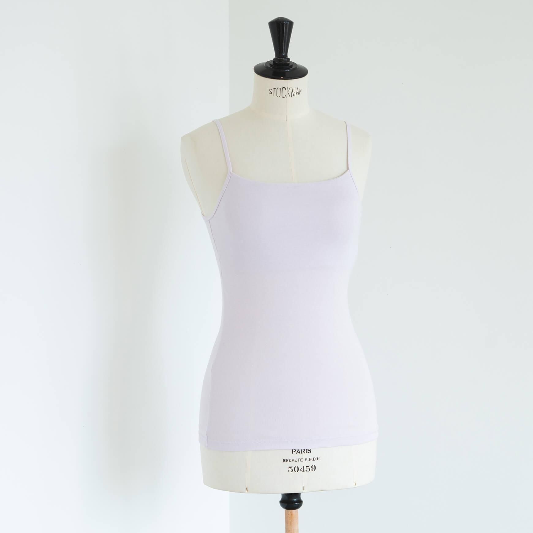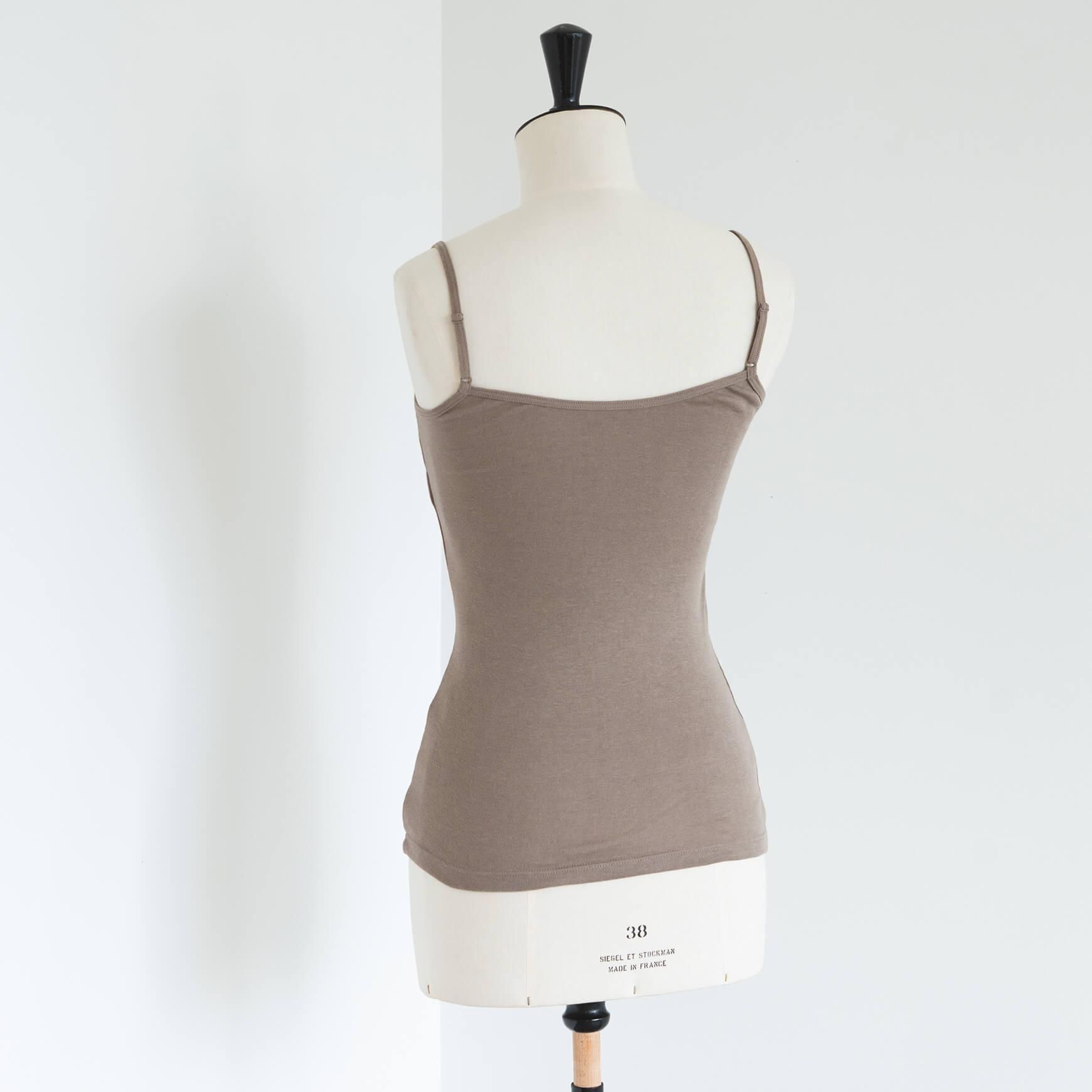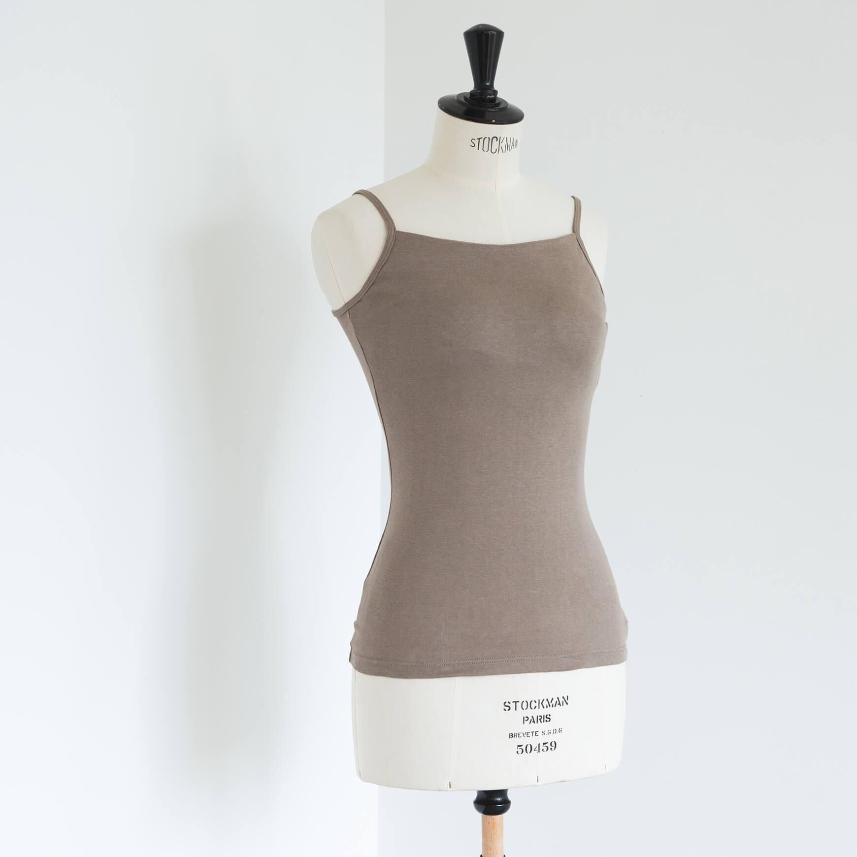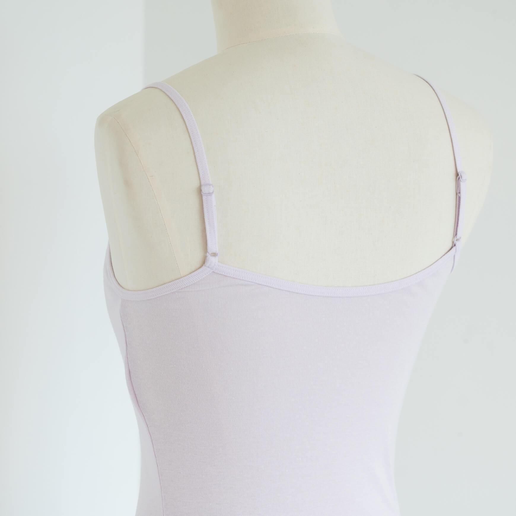 シンプルに見えるデザインにも、こだわりが詰まっています。ちらっと見えてもインナーぽく見えないように、フロントのデザインは、フラットに仕上げています。また、肩紐も身生地と同じコットンシルクを使用。 化繊のストラップが苦手な方にも安心です。
