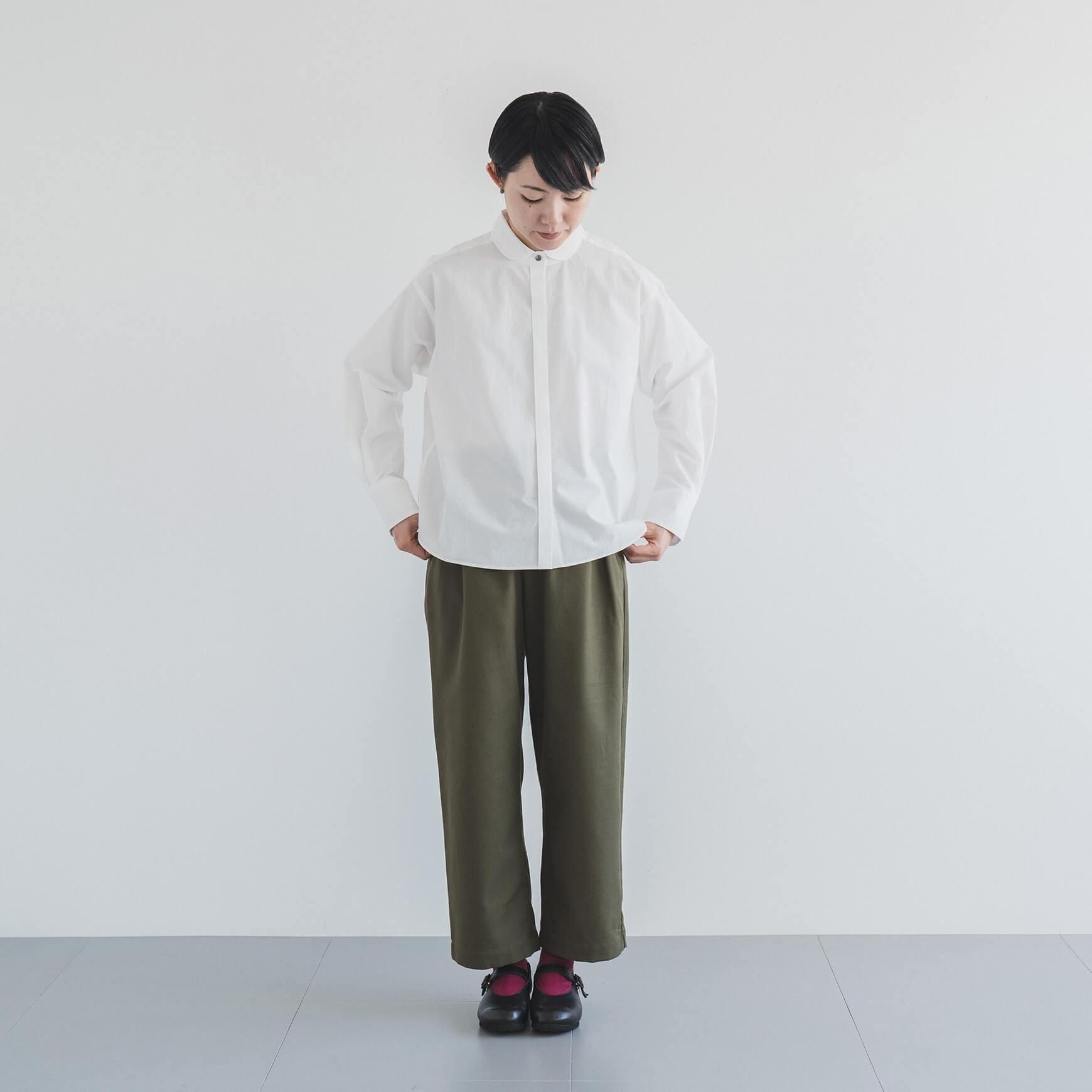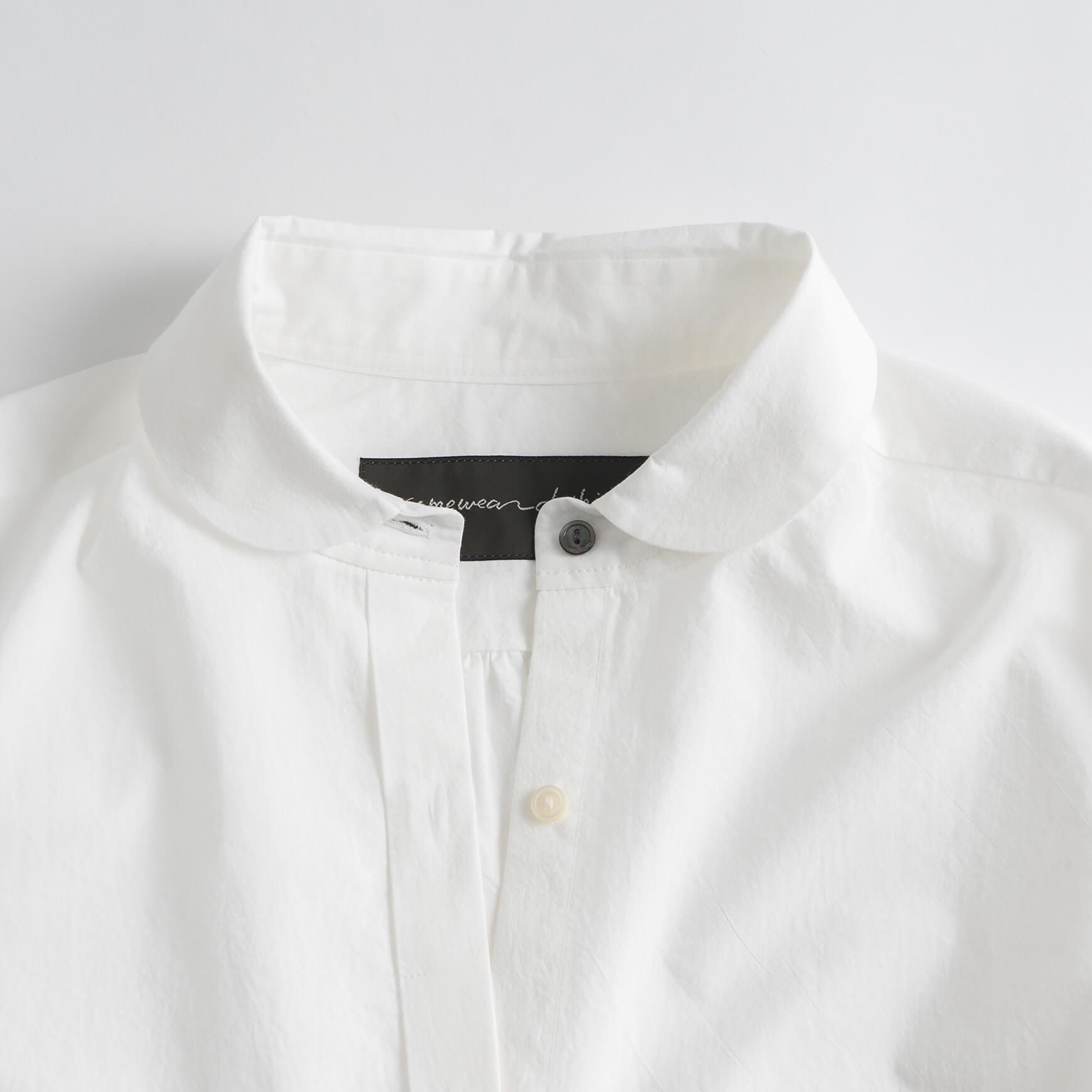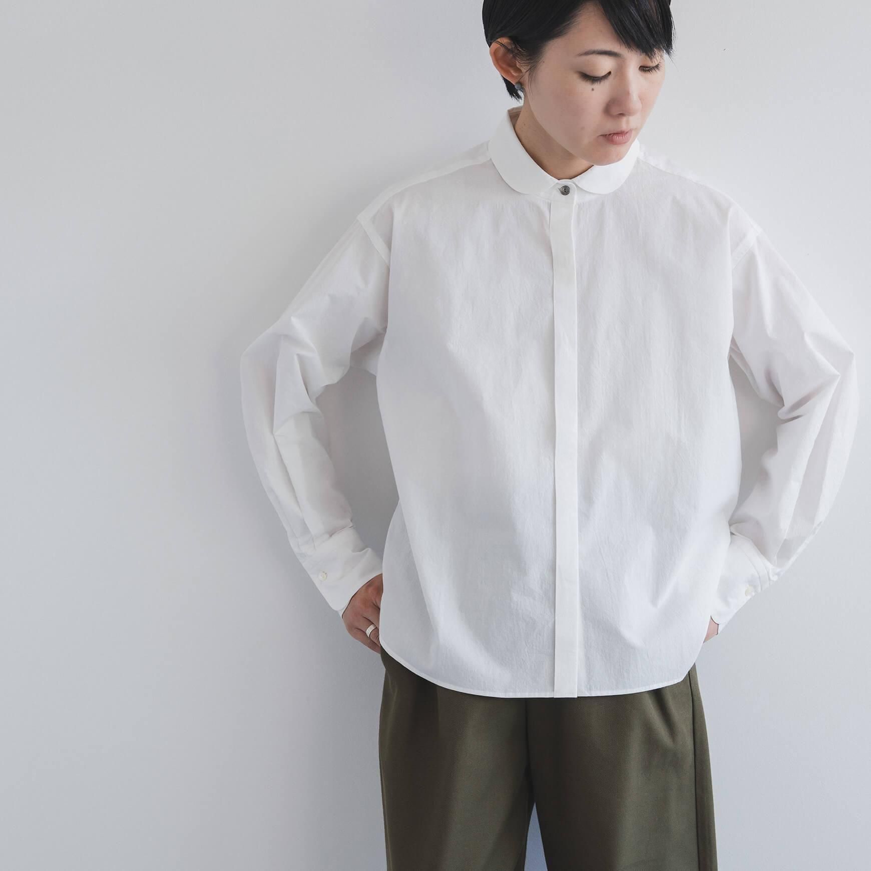 こちらは、オフホワイトの丸襟タイプライターシャツ。