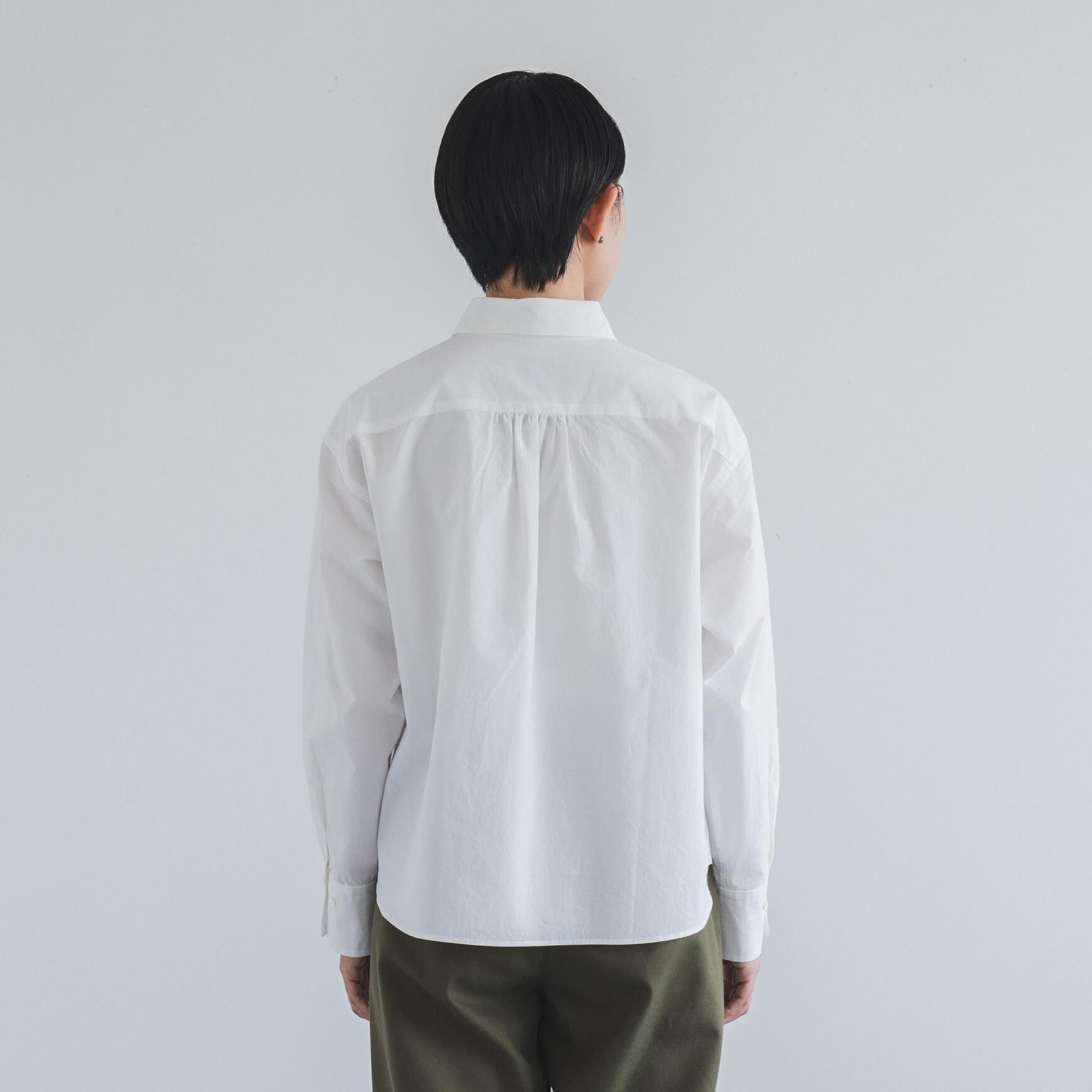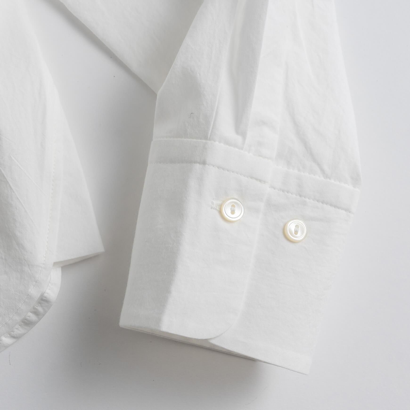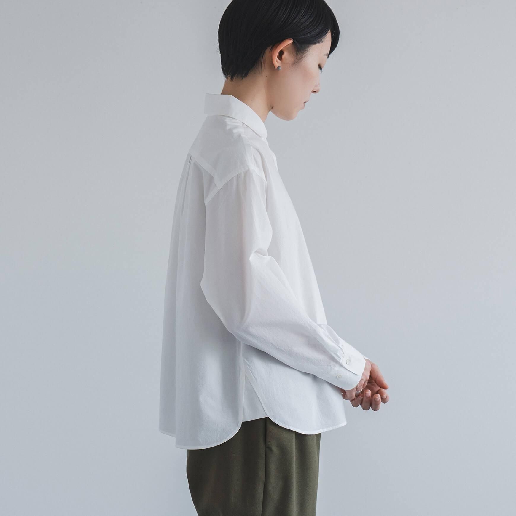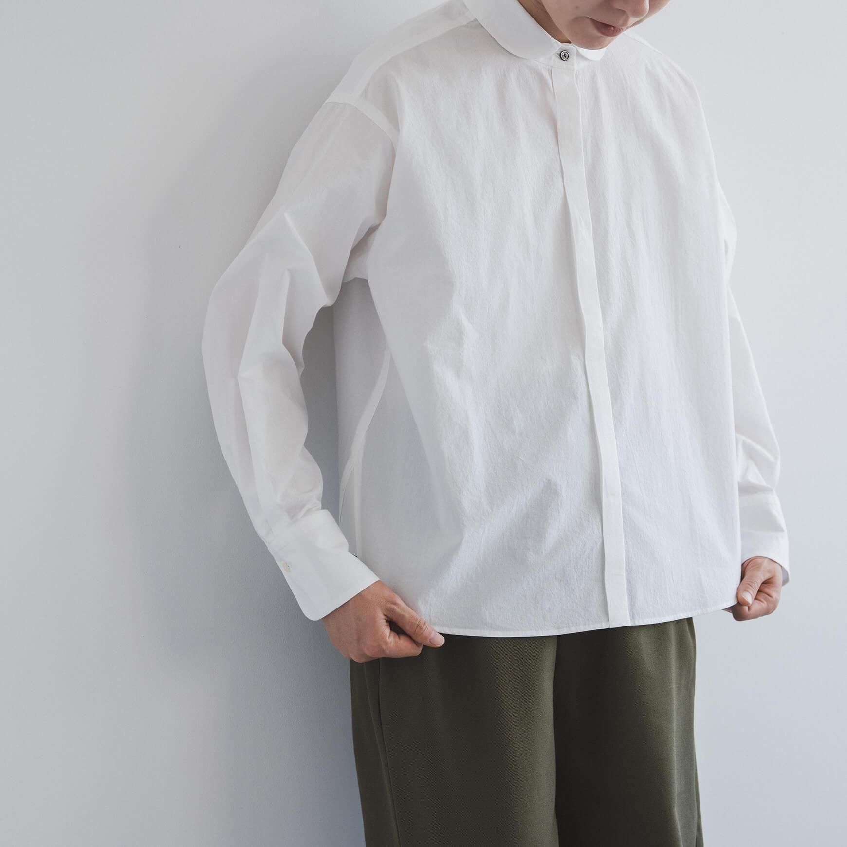 こちらは、オフホワイトの丸襟タイプライターシャツ。