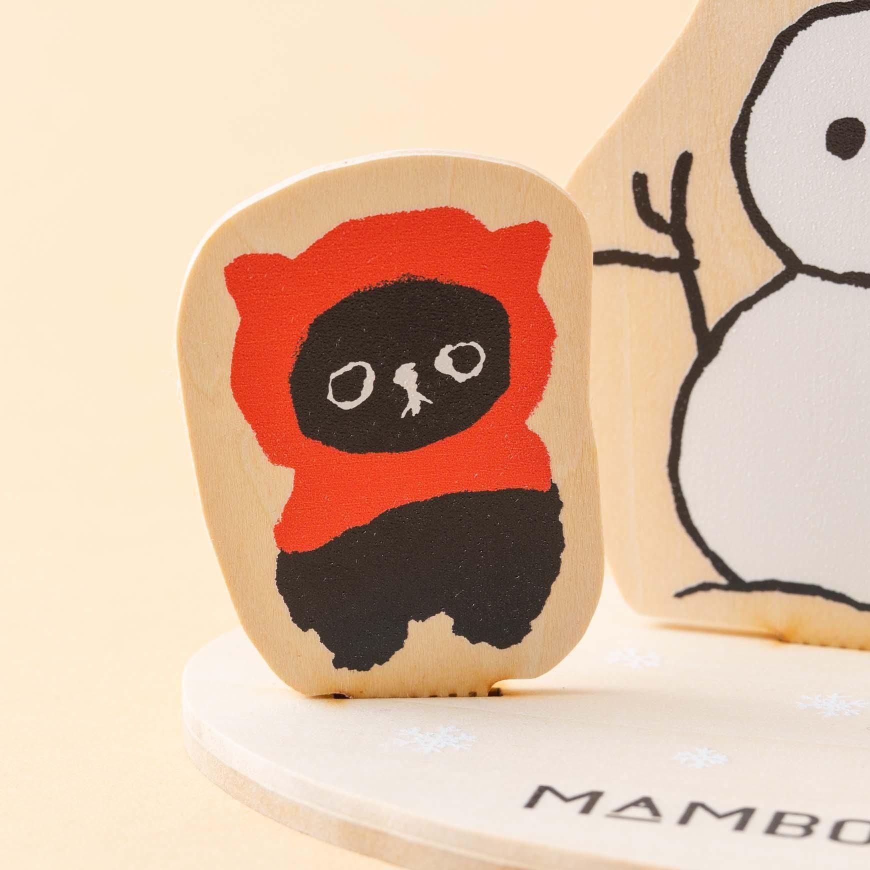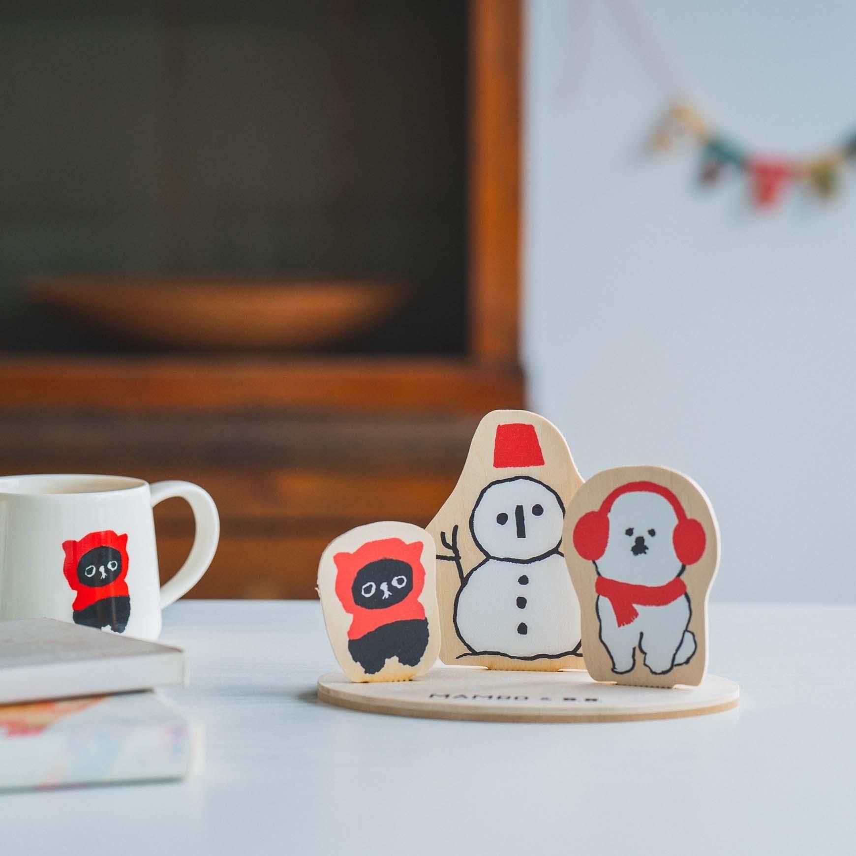 帽子をかぶった雪だるまの前に、真っ赤なイヤーマフとマフラーを巻いてたたずむ MAMBO。